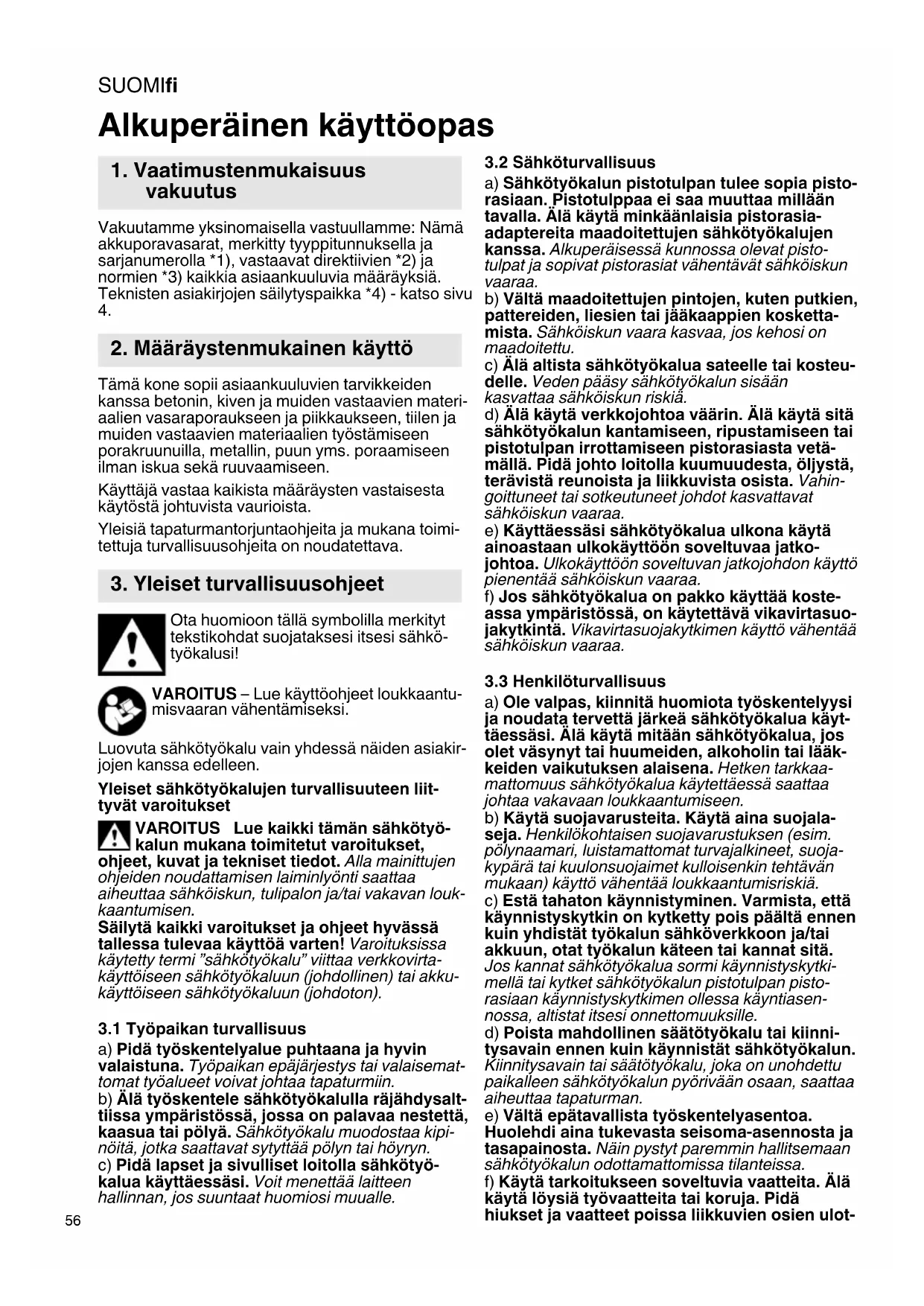 Tämä kone sopii asiaankuuluvien tarvikkeiden kanssa betonin, kiven ja muiden vastaavien materi- aalien vasaraporaukseen ja piikkaukseen, tiilen ja muiden vastaavien materiaalien työstämiseen porakruunuilla, metallin, puun yms. poraamiseen ilman iskua sekä ruuvaamiseen. Käyttäjä vastaa kaikista määräysten vastaisesta käytöstä johtuvista vaurioista. Yleisiä tapaturmantorjuntaohjeita ja mukana toimi- tettuja turvallisuusohjeita on noudatettava. Ota huomioon tällä symbolilla merkityt tekstikohdat suojataksesi itsesi sähkö- työkalusi! VAROITUS – Lue käyttöohjeet loukkaantu- misvaaran vähentämiseksi. Luovuta sähkötyökalu vain yhdessä näiden asiakir- jojen kanssa edelleen. Yleiset sähkötyökalujen turvallisuuteen liit- tyvät varoitukset VAROITUS Lue kaikki tämän sähkötyö- kalun mukana toimitetut varoitukset, ohjeet, kuvat ja tekniset tiedot. Alla mainittujen ohjeiden noudattamisen laiminlyönti saattaa aiheuttaa sähköiskun, tulipalon ja/tai vakavan louk- kaantumisen. Säilytä kaikki varoitukset ja ohjeet hyvässä tallessa tulevaa käyttöä varten! Varoituksissa käytetty termi ”sähkötyökalu” viittaa verkkovirta- käyttöiseen sähkötyökaluun (johdollinen) tai akku- käyttöiseen sähkötyökaluun (johdoton).