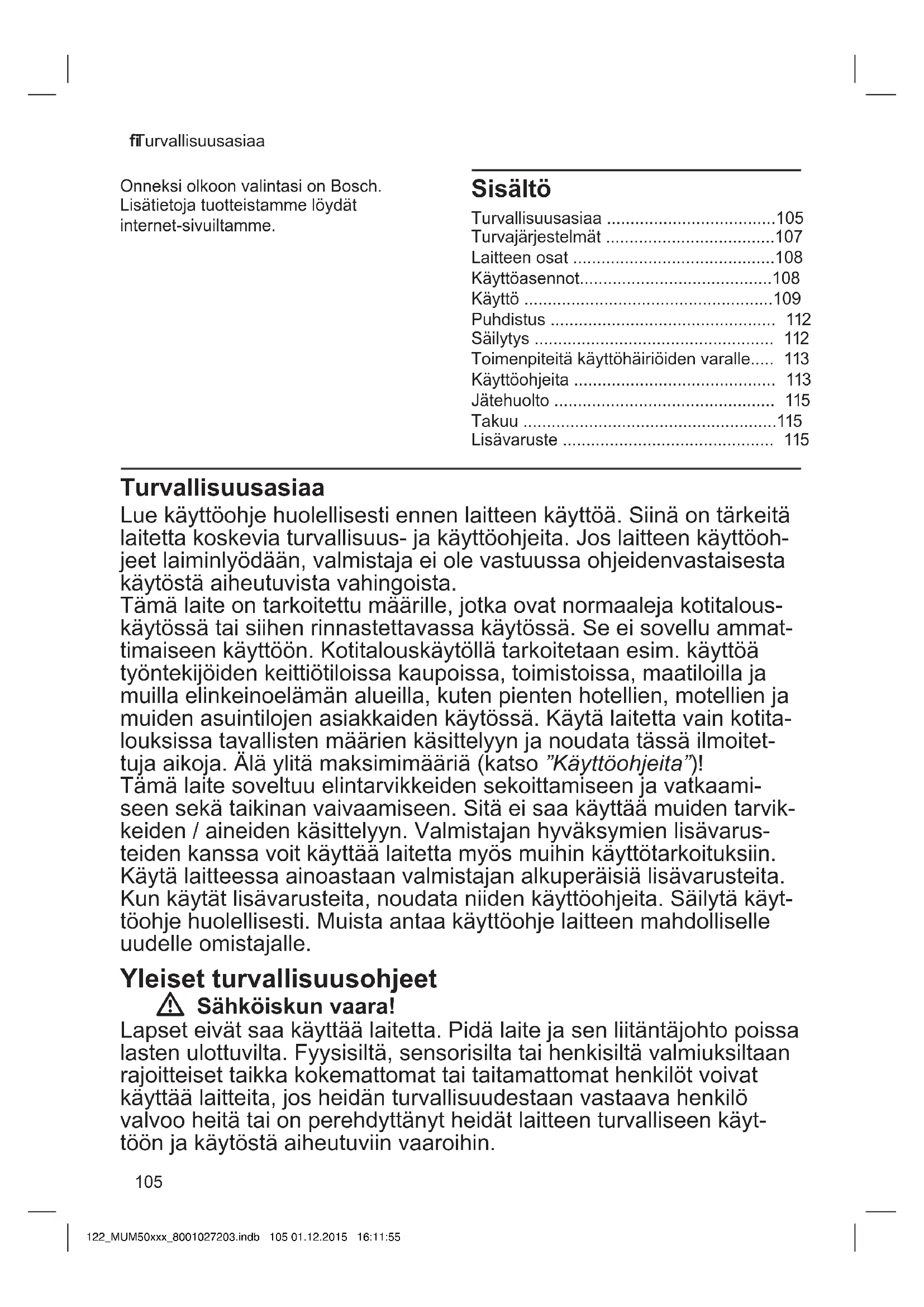 - Turvallisuusasiaa OnneksiolkoonvalintasionBosch. Lisätietojatuotteistammelöydät internet-sivuiltamme. Sisältö Turvallisuusasiaa p. 105