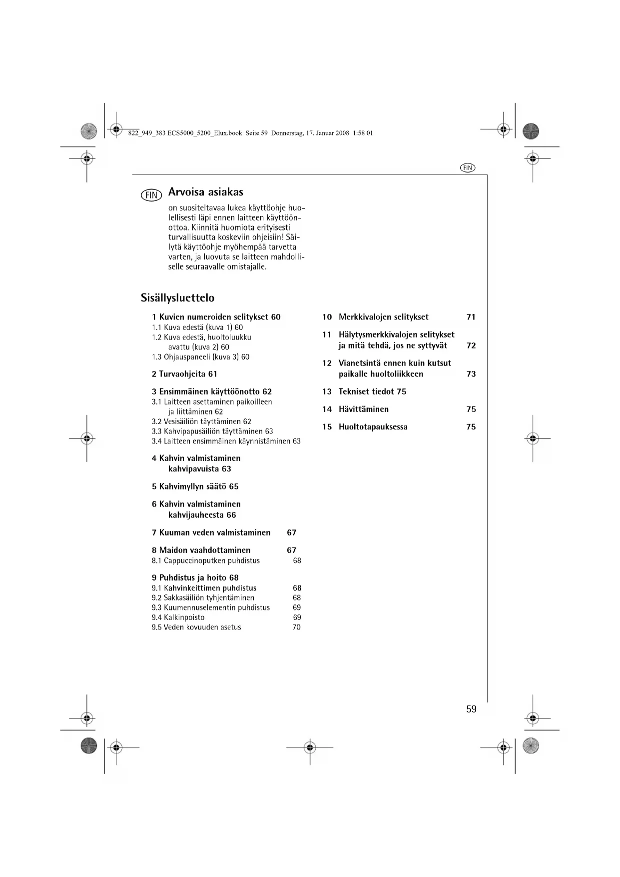 9 Puhdistus ja hoito 68 9.1 Kahvinkeittimen puhdistus 689.2 Sakkasäiliön tyhjentäminen 689.3 Kuumennuselementin puhdistus 699.4 Kalkinpoisto 699.5 Veden kovuuden asetus 70 10 Merkkivalojen selitykset 71 11 Hälytysmerkkivalojen selitykset ja mitä tehdä, jos ne syttyvät 72 12 Vianetsintä ennen kuin kutsut paikalle huoltoliikkeen 73 13 Tekniset tiedot 75 14 Hävittäminen 75 15 Huoltotapauksessa 75 822_949_383 ECS5000_5200_Elux.book Seite 59 Donnerstag, 17. Januar 2008 1:58 01q