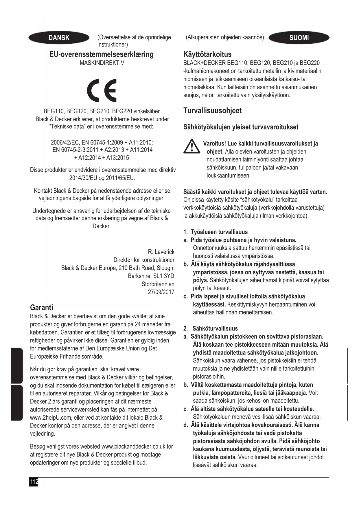BEG110, BEG120, BEG210, BEG220 Kulmahiomakone Black & Decker ilmoittaa, että tuotteet, jotka on kuvattu kohdassa Tekniset tiedot, täyttävät seuraavien direktiivien vaatimukset: 2006/42/EY, EN 60745-1:2009 + A11:2010; EN 60745-2-3:2011 + A2:2013 + A11:2014 + A12:2014 + A13:2015 Nämä tuotteet täyttävät myös direktiivien 2014/30/EU ja 2011/65/EU vaatimukset. Lisätietoja saa ottamalla yhteyden Black & Deckeriin seuraa- vassa osoitteessa. Tiedot ovat myös käyttöohjeen takakannessa. Allekirjoittanut vastaa teknisten tietojen kokoamisesta tehden tämän ilmoituksen Black & Deckerin puolesta. R. Laverick Teknisen osaston johtaja Black & Decker Europe, 210 Bath Road, Slough, Berkshire, SL1 3YD Iso-Britannia