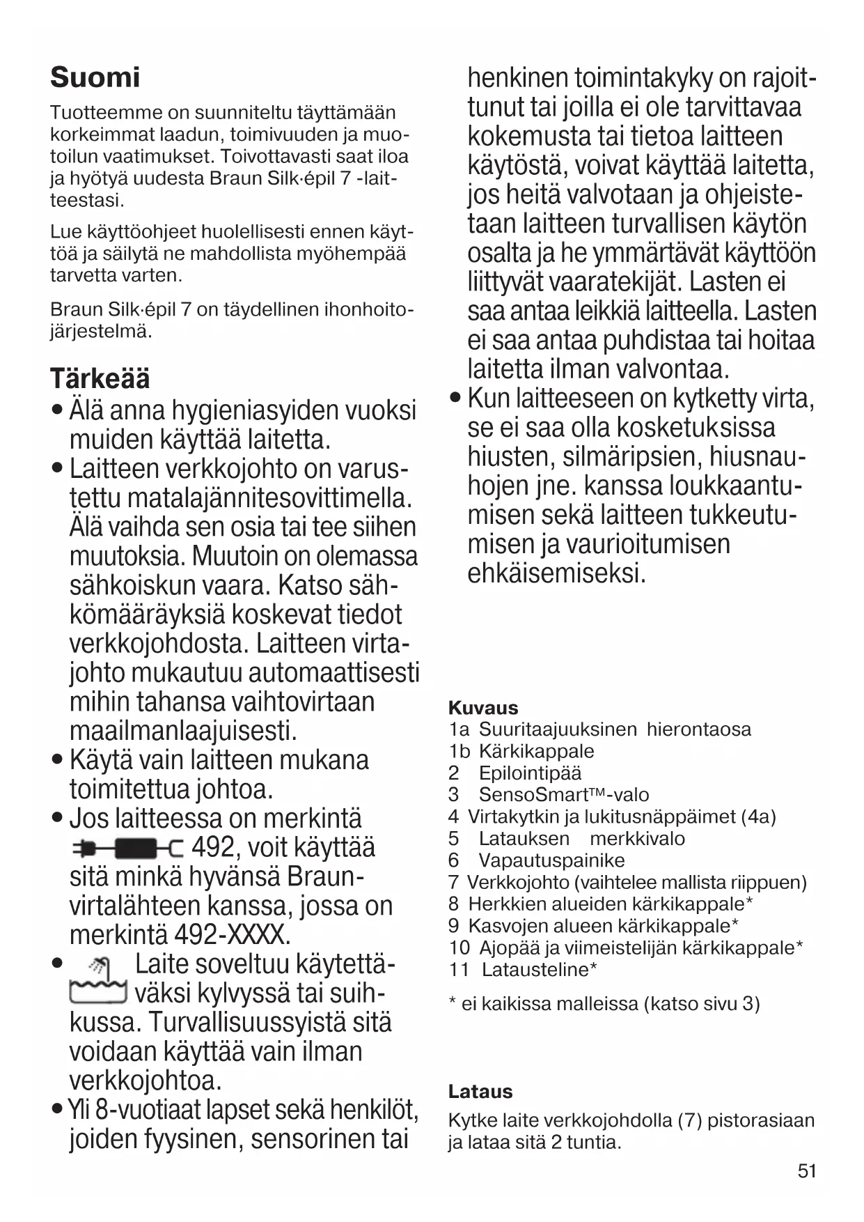 valo on muistutus siitä, että laitetta ei saa painaa liian kovaa. 3 Säärien epilointi Epiloi sääret säären alaosasta ylöspäin. Kun epiloit polven takaa, pidä jalka suo- raksi ojennettuna. 4 Kainaloiden ja bikinirajan epilointi Herkkien alueiden kärkikappale (8) on kehitetty erityisesti näitä alueita varten. Ota huomioon, että varsinkin ensimmäi- sillä epilointikerroilla nämä alueet ovat eri- tyisen kipuherkkiä. Sen vuoksi ensimmäi- siin epilointikertoihin suositellaan nopeusasetusta «I». 91392805_SES_7_890_880_870_860_700_JUNO_S6-124.indd 5291392805_SES_7_890_880_870_860_700_JUNO_S6-124.indd 52 06.06.17 11:1006.06.17 11:10 CSS APPROVED Effective Date 6Jun2017 GMT - Printed 30Aug2017 Page 52 of 12453 Toistuvassa käytössa kivun tunne vähe- nee. Puhdista epiloitava alue perusteelli- sesti jäämista (kuten deodorantista) ennen epilointia. Taputtele sen jälkeen iho kuivaksi pyyhkeellä. Pidä kainaloita epiloi- dessasi käsivartta kohotettuna, jolloin iho venyy, ja ohjaa laitetta eri suuntiin. Koska iho voi olla herkempi heti epiloinnin jäl- keen, vältä käyttämästä ihoa ärsyttäviä aineita, kuten alkoholia sisältäviä deodo- rantteja. 5 Kasvojen epilointi Kun haluat poistaa ei-toivottuja ihokarvoja kasvoilta tai muilta herkiltä ihoalueilta, käytä kasvojen alueen kärkikappaletta (9). Se on lisäosa, joka asetetaan epilointipää- hän (2). Ensimmäisillä käyttökerroilla suositellaan nopeusasetusta«I», jotta totut epiloinnin aiheuttamaan tunteeseen herkillä alueilla. Suosittelemme ihon huolellista puhdista- mista alkoholia sisaltavalla desinfioivalla kasvovedellä. Epiloidessasi kasvoja venytä ihoa yhdellä kädellä ja ohjaa epi- laattoria hitaasti toisella kädellä virtakytki- men suuntaan. 6 Epilointipään puhdistus Säännöllinen puhdistus takaa paremman tehon. a Puhdistus puhdistusharjalla: Irrota kärkikappale ja harjaa se. Puhdista epilaattorin takaosan pinsetit perusteelli- sesti alkoholiin kostutetulla harjalla. Käännä samalla pinsettiosaa kasin. Tämä puhdistusmenetelmä tekee epilointi- päästä mahdollisimman hygieenisen. b Puhdistus juoksevan veden alla: Puhdista laite jokaisen märkäajon jälkeen juoksevassa vedessä. Poista pää ja pidä laitetta ja epilointipäätä kuuman juoksevan veden alla. Irrota sen jälkeen epilointipää painamalla vapautuspainiketta (6). Poista ylimääräinen vesi ravistelemalla laitetta ja epilointipäätä. Anna molempien osien kuivua täysin ennen niiden kokoamista uudelleen. Yleistä tietoa epiloinnista Kaikki ihokarvanpoistomenetelmät, joissa karvat poistetaan juuresta, voivat aiheut- taa ihoärsytystä (esim. ihon kutinaa, epä- mukavuutta tai punoitusta) ihon ja ihokar- vojen kunnosta riippuen. Kyseessä on normaali reaktio, joka häviää yleensä nopeasti. Reaktio voi kuitenkin olla voi- makkaampi, kun ihokarvoja poistetaan juuresta ensimmäisiä kertoja tai jos sinulla on herkkä iho. Jos iho on ärtynyt vielä 36 tunnin kuluttua, suosittelemme käänty- mistä lääkärin puoleen. Yleensä ihoreak- tiot ja kivun tunne vähenevät huomatta- vasti, kun Silk·épil-laitetta käytetään toistuvasti. Joissakin tapauksissa tulehdus voi syntyä, kun ihon sisään pääsee bakteereja (esi- merkiksi kun laitetta liikutellaan iholla). Epilointipään perusteellinen puhdistus ennen jokaista käyttökertaa vähentää tulehdusriskiä. Jos et ole varma laitteen soveltuvuudesta itsellesi, ota yhteyttä lääkäriin. Seuraa- vissa tapauksissa laitetta tulisi käyttää vasta, kun asiasta on keskusteltu lääkärin kanssa: ihottuma, haavat, tulehtunut iho kuten karvan juuritupen tulehdus (märkivä karvatuppi) ja suonikohjut, luomen ympäristö, ihon heikentynyt vastustuskyky, syynä esim. diabetes, raskausaika, Raynaud‘n oireyhtymä, verenvuototauti, hiivatulehdus tai heikko vastustuskyky. B Ajopään käyttö Ajopää (10) on suunniteltu säärien, kaina- loiden ja bikinirajan nopeaan ja tarkkaan ajamiseen, rajaukseen ja ihokarvojen leik- kaamiseen 5 mm:n pituisiksi. Käytä ajo- pääosaa ainoastaan kuivalla iholla ja nopeusasetuksella II. a Ajaminen: valitse « ». b Rajaus: valitset « ». c Ihokarvojen ajaminen 5 mm:n pituisiksi: valitse « » ja aseta viimeistelijän kärki- kappale paikalleen (I). 91392805_SES_7_890_880_870_860_700_JUNO_S6-124.indd 5391392805_SES_7_890_880_870_860_700_JUNO_S6-124.indd 53 06.06.17 11:1006.06.17 11:10 CSS APPROVED Effective Date 6Jun2017 GMT - Printed 30Aug2017 Page 53 of 12454 d Puhdistaminen: Älä puhdista teräverk- koa (II) harjalla, koska se saattaa vahin- goittaa teräsverkkoa. e Ajo-osat tulee voidella säännöllisesti 3 kuukauden välein. f Vaihda teräverkko (II) ja leikkuri (III), kun huomaat ajotuloksen heikentyvän. Varaosia saa jälleenmyyjältä, Braunin asiakaspalvelusta tai osoitteesta www.service.braun.com. Älä käytä, jos teräverkko on vaurioitunut. Ympäristöseikkoihin liittyviä tietoja Tässä laitteessa on ladattavat akut. Ympäristönsuojelullisista syistä tuo- tetta ei saa hävittää kotitalousjät- teen mukana käyttöiän päättyessä. Hävitä tuote viemällä se Braun-huoltoliik- keeseen tai asianmukaiseen keräyspis- teeseen. Tiedot voivat muuttua ilman ennakkoilmoi- tusta. Takuu Tälle tuotteelle myönnämme 2 vuoden takuun ostopäivästä lukien Suomessa voimassa olevien alan takuuehtojen TE90 mukaan. Takuuaikana korvataan veloituksetta kaikki viat, jotka aiheutuvat materiaaliviasta tai valmistusvirheestä. Korvaus tapahtuu harkintamme mukaan korjaamalla, vaihtamalla viallinen osa tai vaihtamalla koko laite uuteen. Takuu on voimassa kaikkialla maailmassa sillä edel- lytyksellä, että laitetta myydään ko. maassa Braunin tai virallisen maahan- tuojan toimesta. Takuun piiriin eivät kuulu seuraavat viat: viat, jotka johtuvat virheellisestä käytöstä, normaalista kulumisesta tai viat, jolla on vähäinen merkitys laitteen arvoon tai toi- mintaan. Takuun voimassaolo lakkaa, jos laitetta korjataan muualla kuin val
