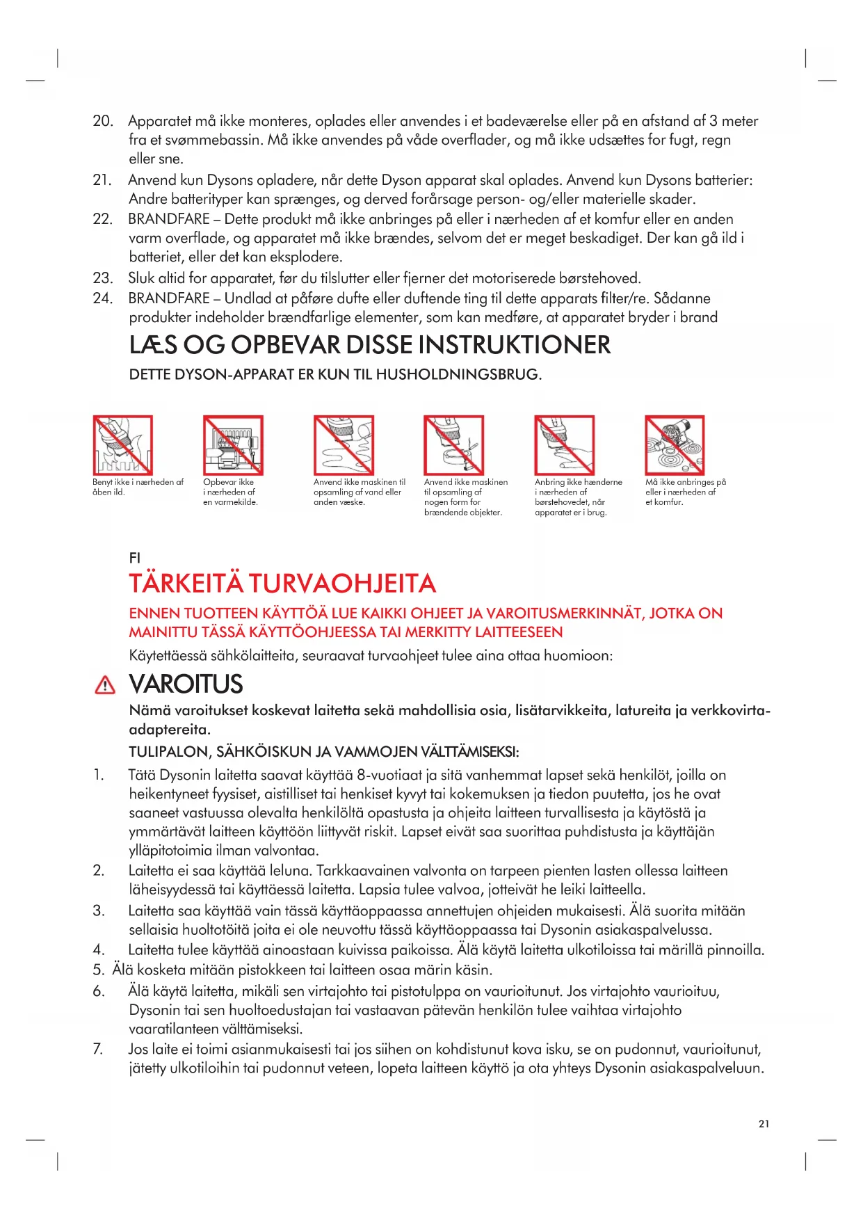 jätetty ulkotiloihin tai pudonnut veteen, lopeta laitteen käyttö ja ota yhteys Dysonin asiakaspalveluun.22 Älä käytä avotulen läheisyydessä. Älä säilytä lämmönlähteiden läheisyydessä. Älä imuroi vettä tai muita nesteitä. Älä imuroi palavia esineitä. Älä laita käsiä harjasuulakkeen läheisyyteen laitteen ollessa käytössä. Älä sijoita hellan päälle tai läheisyyteen.