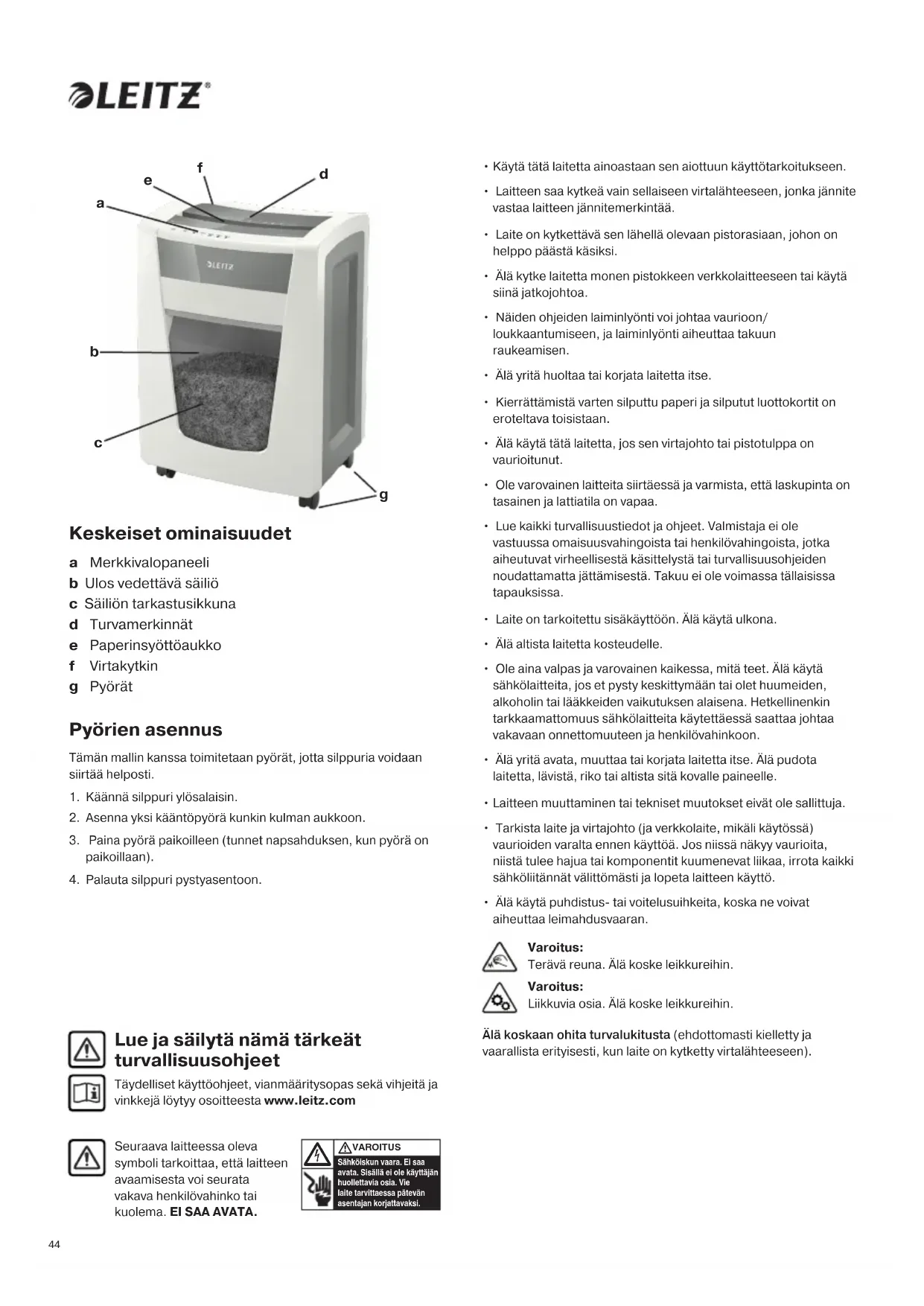 - Muista lukita pyörät paikoilleen, jos silppuria on siirretty.47 Sähkö- ja elektroniikkalaiteromu Tuote katsotaan sähkö- ja elektroniikkalaiteromuksi sen käyttöiän päätyttyä. Siksi on tärkeää muistaa seuraavat: Sähkö- ja elektroniikkalaiteromu täytyy loppukäsitellä erillään lajittelemattomista yhdyskuntajätteistä. Sähkö- ja elektroniikkalaiteromu on kerättävä erikseen, jotta se voidaan purkaa ja sen osat ja materiaalit voidaan kierrättää, käyttää uudelleen ja hyödyntää (polttoaineena energian hyödyntämiseen sähköntuotannossa). Kunnat ovat järjestäneet yleisiä sähkö- ja elektroniikkalaiteromun keräyspisteitä, joiden käyttö on maksutonta. Palauta sähkö- ja elektroniikkalaiteromu kotia tai työpaikkaa lähinnä olevaan keräyspisteeseen. Jos sinulla on vaikeuksia löytää keräyspistettä, tuotteen myyneen vähittäiskaupan on vastaanotettava sähkö- ja elektroniikkalaiteromu. Jos et ole enää yhteydessä vähittäiskauppaan, ota yhteys ACCO- yhtiöön tässä asiassa. Sähkö- ja elektroniikkalaiteromun kierrätyksen tarkoituksena on suojella ympäristöä ja ihmisten terveyttä, säilyttää raaka- aineita, parantaa kestävää kehitystä ja varmistaa hyödykkeiden parempi saatavuus Euroopan unionissa. Tavoitteeseen päästään noutamalla arvokkaita toisioraaka-aineita ja vähentämällä loppukäsittelyyn tulevan jätteen määrää. Voit vaikuttaa näiden tavoitteiden onnistumiseen palauttamalla sähkö- ja elektroniikkalaiteromusi keräyspisteeseen. Tuotteessa on sähkö- ja elektroniikkalaiteromun merkitsemiseen käytetty tunnus (jätesäiliö, jonka päällä on X-merkintä). Tämä tunnus kertoo, että sähkö- ja elektroniikkalaiteromua ei saa loppukäsitellä yhdessä lajittelemattoman yhdyskuntajätteen kanssa. Takuu Laitteella on normaalikäytössä kahden vuoden takuu ostopäivästä lukien sen toiminnan osalta. Tänä takuuaikana ACCO Brands Europe harkintansa mukaan joko korjaa tai vaihtaa viallisen laitteen veloituksetta. Takuu ei kata virheellisestä tai asiattomasta käytöstä aiheutuneita vikoja. Ostotodistus on esitettävä. Jos laitetta korjaa tai muuttaa muu kuin ACCO Brands Europen valtuuttama henkilö, takuu raukeaa. Tavoitteemme on varmistaa, että tuotteemme toimivat ohjeissa kuvatulla tavalla. Tämä takuu ei vaikuta lakisääteisiin oikeuksiin, joita kuluttajilla on eri maissa sovellettavan kansallisen lainsäädännön nojalla ja joiden alaisuudessa tavaroiden myynti tapahtuu. Lisävarusteet Käytä ainoastaan Leitzin lisävarusteita: Voiteluarkit - 80070000 Muovipussit – 80080000 Vianetsintä Jos silppuri ei käynnisty, tarkista seuraavat: