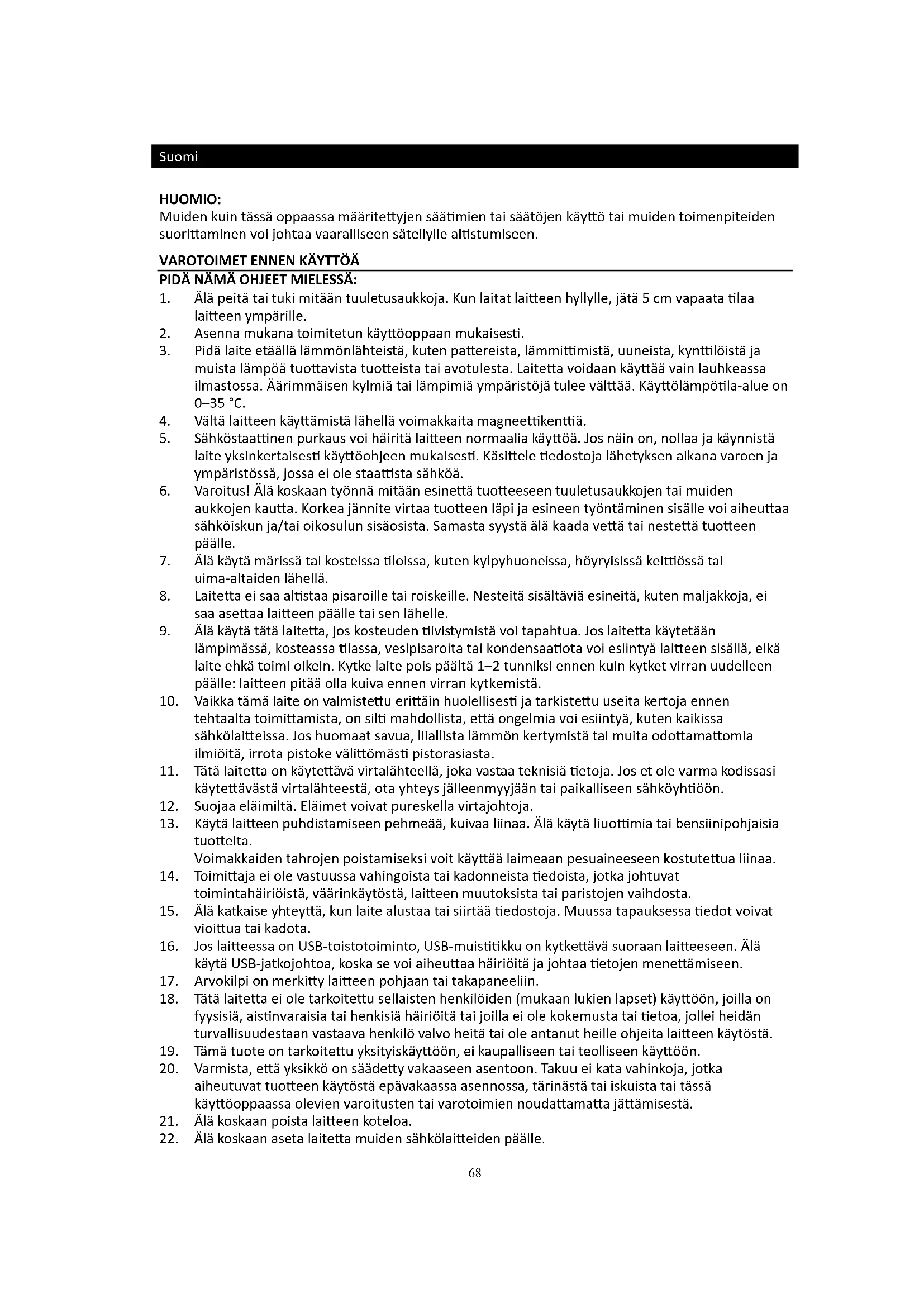 22. Älä koskaan aseta laitetta muiden sähkölaitteiden päälle.69