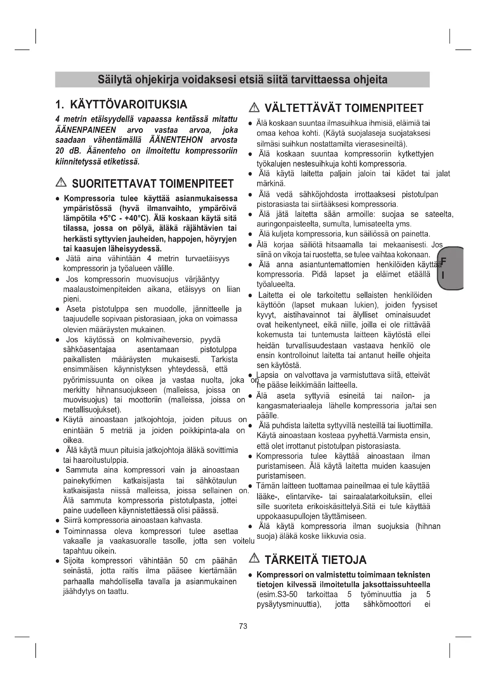 ● Kompressori on valmistettu toimimaan teknisten tietojen kilvessä ilmoitetulla jaksottaissuhteella (esim.S3-50 tarkoittaa 5 työminuuttia ja 5 pysäytysminuuttia), jotta sähkömoottori ei74