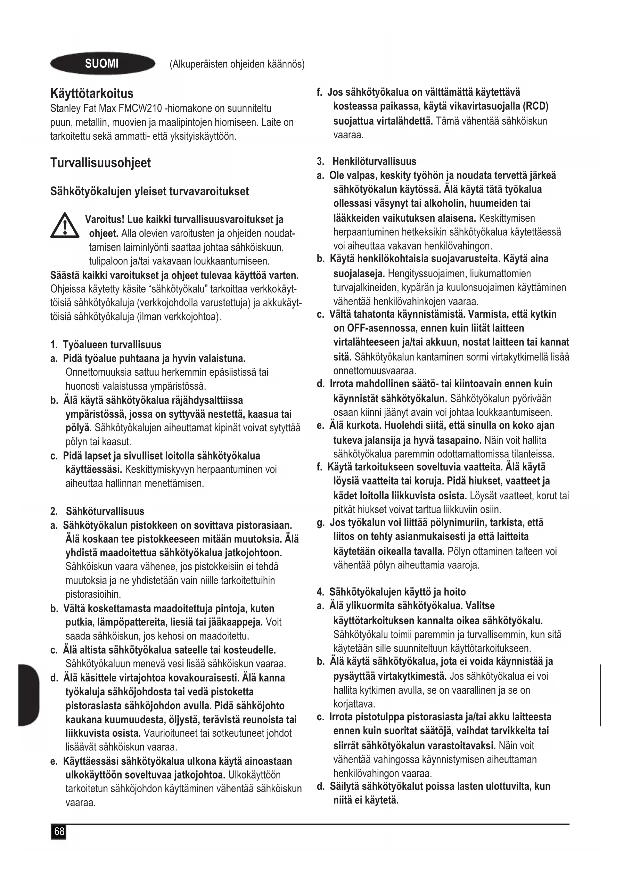 Takuu Stanley Fat Max on vakuuttunut tuotteidensa korkeasta laadusta ja tarjoaa kuluttajille 12 kuukauden takuun, joka astuu voimaan ostopäivänä. Takuu on lisäys kuluttajan lail- lisiin oikeuksiin eikä vaikuta niihin. Tämä takuu on voimassa kaikissa EU- ja ETA-maissa. Edellytyksenä takuun saamiselle on, että vaade täyttää Stanley Fat Maxin ehdot ja että ostaja toimittaa ostotositteen jälleenmyyjälle tai valtuutetulle huoltoliikkeelle. Stanley Fat Maxin yhden vuoden takuun ehdot ja lähimmän valtuutetun korjauspalvelun yhteystiedot ovat saatavilla osoit- teessa www.2helpU.com tai ottamalla yhteyttä paikalliseen Stanley Fat Maxin toimipisteeseen tässä ohjekirjassa ilmoitet- tuihin osoitteisiin. Käy verkkosivuillamme osoitteessa www.stanley.eu/3 ja rekis- teröi uusi Stanley Fat Max -tuotteesi saadaksesi tietoa uusista tuotteista ja erikoistarjouksista.74 (Μετάφραση των πρωτότυπων οδηγιών) Προβλεπόμενη χρήση Το τριβείο σας Stanley Fat Max FMCW210 έχει σχεδιαστεί για το γυαλοχάρτισμα ξύλου, μετάλλου, πλαστικών και βαμμένων επιφανειών. Αυτή η συσκευή προορίζεται για επαγγελματική και ιδιωτική, μη επαγγελματική χρήση. Οδηγίες ασφαλείας Γενικές προειδοποιήσεις ασφαλείας για ηλεκτρικά