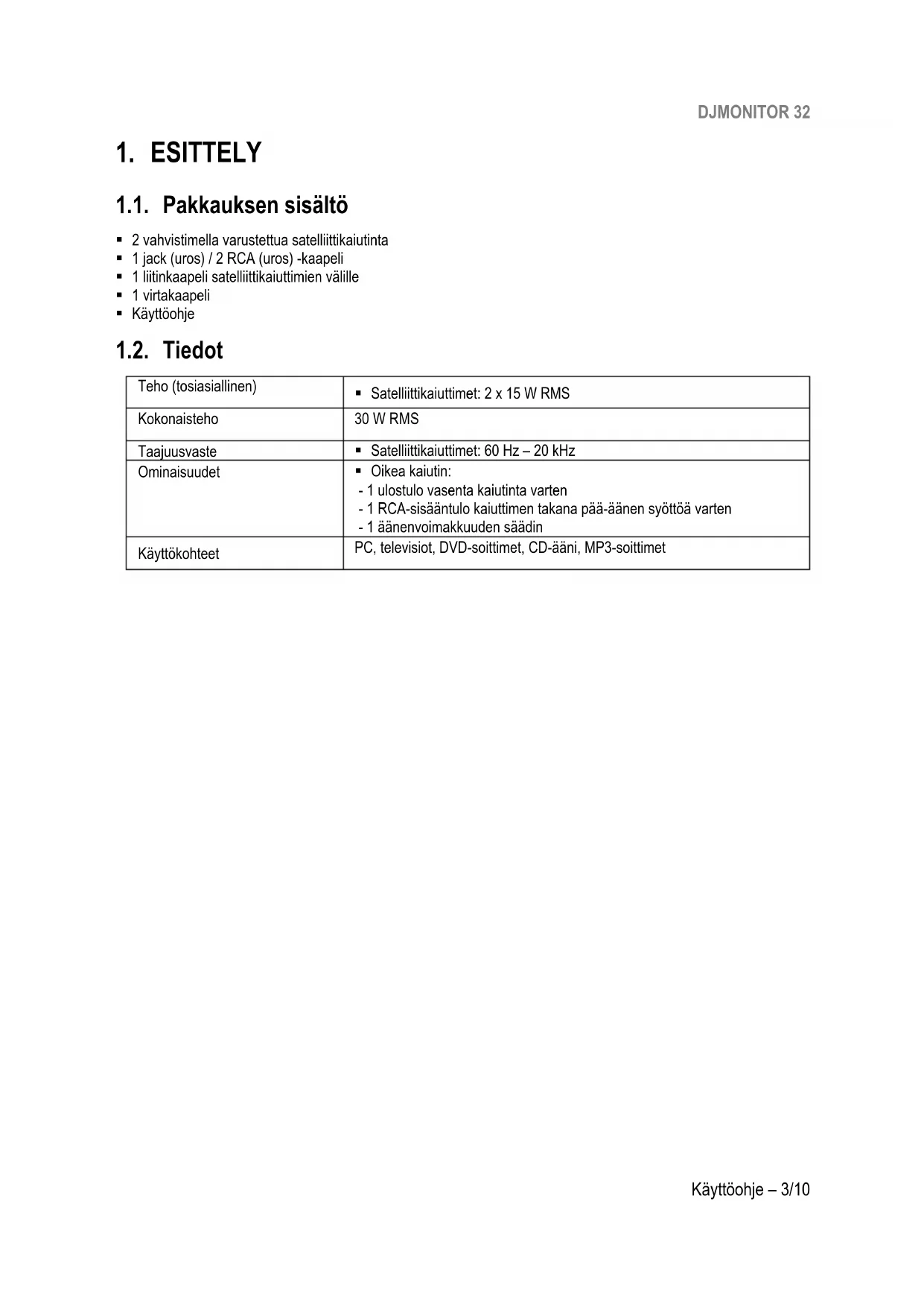 - Oikea kaiutin: - 1 ulostulo vasenta kaiutinta varten - 1 RCA-sisääntulo kaiuttimen takana pää-äänen syöttöä varten - 1 äänenvoimakkuuden säädin Käyttökohteet PC, televisiot, DVD-soittimet, CD-ääni, MP3-soittimetDJMONITOR 32 4/10 – Käyttöohje 1.3. Suositukset - Aseta satelliittikaiuttimet tasaiselle pinnalle estääksesi niitä putoamasta. - Älä ikinä avaa kaiutinsettiä, sillä voit vahingoittaa sen sisäisiä komponentteja. - Tämä kaiutinsetti on tarkoitettu lauhkeaan ympäristöön. - Välttääksesi tulen tai sähköiskun riskiä pidä kaiutinsetti erossa: - sateesta tai kosteista paikoista, mukaan lukien nesteistä (vesi, kemialliset tuotteet tai muut nesteet), - lämmön lähteistä, kuten lämmityslaitteista, liesistä tai muista lämpöä tuottavista laitteista (mukaan lukien vahvistimet), - suorasta auringonvalosta. - Älä altista kaiutinsettiä vesipisaroille tai räiskeille. - Älä ikinä aseta nestettä sisältäviä astioita (lasi, maljakko...) kaiutinsetin päälle. - Irrota virtakaapeli, jos et aio käyttää kaiutinsettiä pitempään aikaan. Irrota virtakaapeli tarttumalla liittimeen ja vetämällä siitä, älä koskaan vedä johdosta. - Varmista, että kaiutinsetin pistokkeeseen liitetty virtajohto on helposti saatavilla. - Irrota kaiutinsetti ennen puhdistamista. Käytä kosteaa kangasta ja vältä käyttämästä aerosolilla täytettyjä puhdistimia. - Kaiutinsetin virtajohdolla laitteesta poistetaan virta, joten sen täytyy olla aina helposti saatavilla. - Merkinnät sijaitsevat kaiuttimien takana.