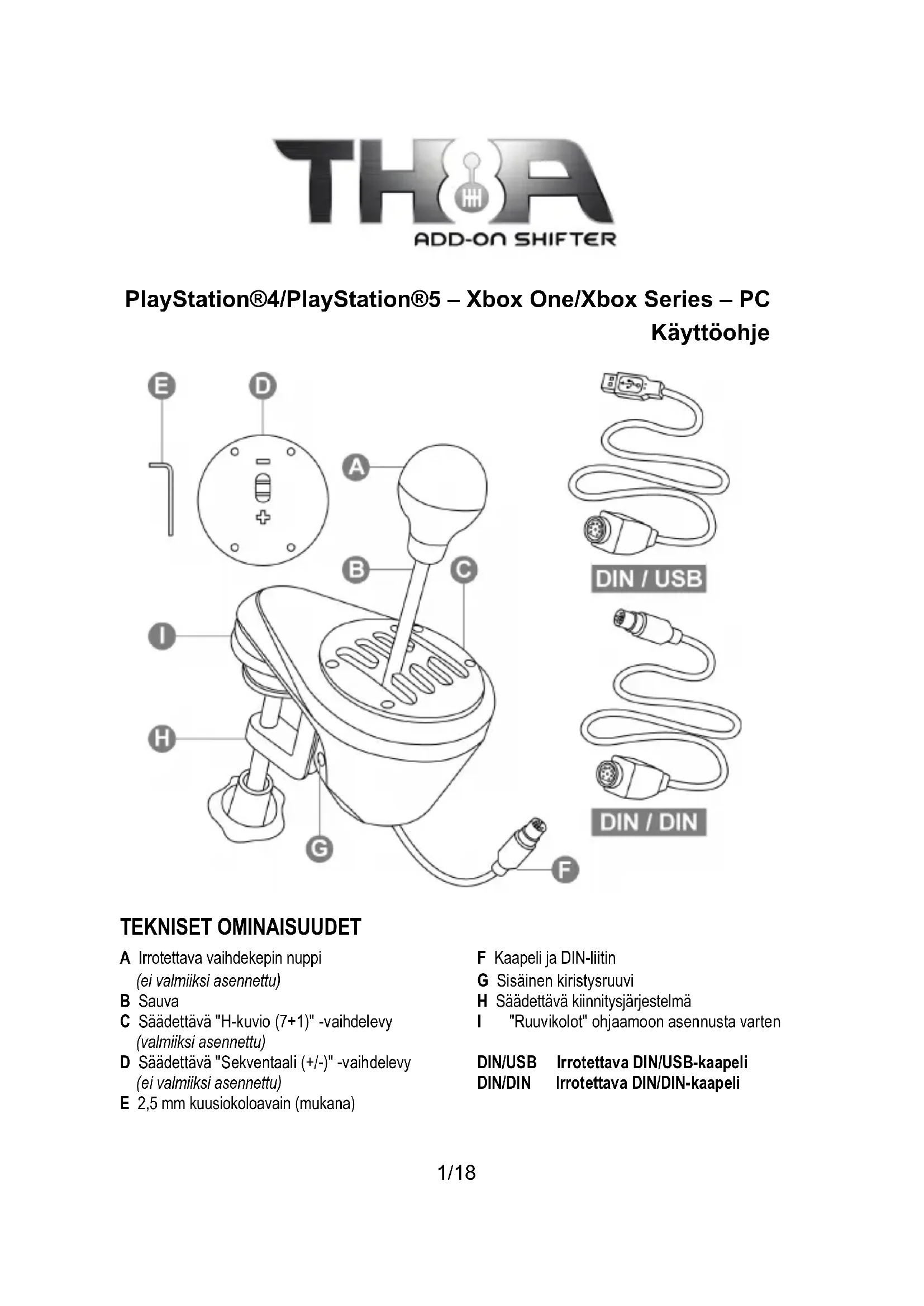 Jotta et vahingoita järjestelmää: - Lopeta kiristäminen, kun tunnet vahvan vastuksen. - Lopeta avaaminen, jos sauva muuttuu löysäksi ja heiluvaksi.11/18 ASENNUSOHJEET PELIKONSOLEILLE PLAYSTATION®4/PLAYSTATION®5 Käyttämäsi PS4™/PS5™-pelin tai rattiohjaimen mukaan: PS4™ = Yhdistä (*) TH8A-vaihteisto suoraan PS4™:n USB-porttiin - Yhdistä TH8A-vaihteiston DIN-liitin DIN/USB-kaapeliin. - Yhdistä TH8A-vaihteisto yhteen PS4™:n USB-porteista. - Käynnistä peli. TH8A-vaihteistoa voidaan käyttää sen jälkeen joko H-KUVIO (7+1)- tai SEKVENTAALI (+/-) - vaihdelevyllä. Tai PS4™/PS5™ = Yhdistä (*) TH8A-vaihteisto suoraan Thrustmaster- rattiohjaimen jalustaan (käytettävissä ainoastaan sisäänrakennetun vaihteistoliittimen sisältävillä Thrustmaster-rattiohjaimilla) - Yhdistä TH8A-vaihteiston DIN-liitin irrotettavaan DIN/DIN-kaapeliin. - Yhdistä TH8A-vaihteisto rattiohjaimen jalustan takana olevaan vaihteistoliittimeen. - Yhdistä rattiohjain ja käynnistä peli. TH8A-vaihteistoa voidaan käyttää sen jälkeen joko H-KUVIO (7+1)- tai SEKVENTAALI (+/-) - vaihdelevyllä. (*) Tärkeät suositukset PS4™/PS5™-järjestelmälle (käytettävissä ainoastaan sisäänrakennetun vaihteistoliittimen sisältävillä Thrustmaster-rattiohjaimilla) - PS4™/PS5™: Kun TH8A-vaihteiston SEKVENTAALI (+/-) -vaihdelevy on käytössä, voit yhdistää vaihteiston rattiohjaimen taakse myös irrotettavaa DIN-/DIN-kaapelia käyttämällä. TH8A-vaihteisto kiinnitetään silloin rattiohjaimen YLÖS (= R1)- ja ALAS (= L1) -vaihdevipuihin. TH8A-vaihteiston Sekventaali (+/-) -vaihdelevy toimii silloin täysin kaikissa PS4™/PS5™:n kilpa- ajopeleissä, jotka ovat rattiohjaimen kanssa yhteensopivia. - PS4™ : Osa peleistä mahdollistaa kahden TH8A-vaihteiston samanaikaisen käytön: yksi TH8A-vaihteisto H-KUVIO (7+1) -vaihdelevyllä yhdistettynä PS4™:n USB-porttiin + yksi TH8A-vaihteisto SEKVENTAALI (+/-) -vaihdelevyllä yhdistettynä rattiohjaimen taakse