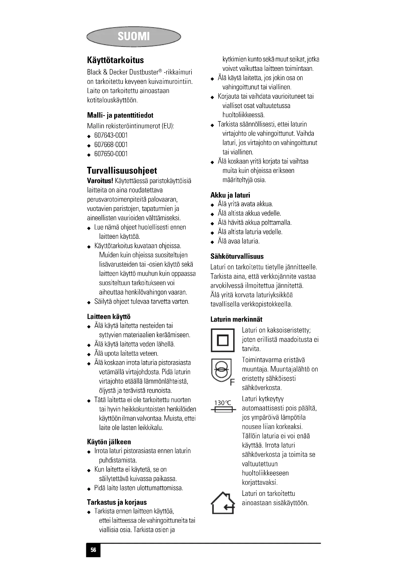 Laitteen tunnistetiedot Luettelonumeron loppuosasta käy ilmi mallin tyyppitunnus. Tässä käyttöohjeessa käsitellään tuotteita, joiden luettelonumero on seuraava: X DV60XXY, DV72XXY, DV96XXY ja DV12XXY. Koodin loppuosan XX viittaa seuraaviin malleihin: X 05: Kaikki laitteet, joiden mukana toimitetaan rako- ja harjasuulake. Koodin loppuosan Y ilmoittaa väri- tai pintavaihtoehdon. Koodin loppuosan Y:n tilalla oleva N viittaa malleihin, joissa on NiMH-akku. Asennus Lataustelineen kiinnittäminen seinään Laturi voidaan asettaa työtasolle tai kiinnittää seinään, ja se on kätevä laitteen säilytys- ja latauspaikka. Varmista seinäkiinnityksessä, että kiinnitystapa on seinätyyppiin ja laitteen painoon nähden sopiva. Kokoaminen Lisälaitteiden kiinnittäminen (kuvat A ja B) Näihin malleihin kuuluu seuraavia lisävarusteita (osa näistä tai kaikki): X Rakosuulake (8), tarkoitettu ahtaiden tilojen imurointiin. X Harjasuulake (9) sopii huonekalujen ja portaiden imurointiin. Kiinnitä lisävaruste seuraavasti: X Irrota lisälaite säilytyspaikastaan joko itse laitteesta tai lataustelineestä (7) (kuvat. L ja M). X Kiinnitä haluamasi lisävaruste laitteen nokkaan. Käyttö X Ennen ensimmäistä käyttökertaa akkua on ladattava vähintään 16 tuntia. X Aseta laite laturiin aina, kun et käytä laitetta. Akun lataaminen (kuva C) Ennen kuin lataat akun: X Tarkista, että pölynkerääjän jatkokappale (1) on työnnetty pölynkerääjän (2) sisään. X Varmista, että laitteen virta on katkaistu. Akku ei lataudu, jos laitteen virta on kytkettynä virtakytkimestä (4). X Aseta laite laturiin (7) kuvan osoittamalla tavalla. X Kytke laturi pistorasiaan. Kytke virta. Latauksen merkkivalo (5) syttyy. X Anna laitteen latautua vähintään 16 tuntia. Laturi lämpenee latauksen aikana. Tämä on normaalia, ei merkki mistään ongelmasta. Laitteen voi jättää kiinni laturiin määräämättömäksi ajaksi. Latauksen merkkivalo (5) palaa niin kauan kuin laite on pistorasiaan liitetyssä laturissa. Varoitus! Älä lataa akkua, jos ympäröivä lämpötila on alle +4 °C tai yli +40 °C. Pölynkerääjän säätäminen (kuva D) X Pidennä pölynkerääjä (2) vetämällä jatkokappaletta (1), kunnes se lukittuu paikoilleen. X Pölynkerääjän jatkokappale (1) palautetaan takaisin paikalleen painamalla nuolella merkittyä aluetta (12) ja työntämällä jatkokappale (1) pölynkerääjän (2) sisään. Käynnistäminen ja sammuttaminen (kuvat E ja F) X Virta kytketään imuriin työntämällä virtakytkintä (4) eteenpäin. X Virta katkaistaan työntämällä virtakytkintä (4) taaksepäin.58 SUOMI DV1205 ja DV9605 - Imutehon optimoiminen (kuva G) Jotta imuteho pysyisi mahdollisimman hyvänä, suodattimet on puhdistettava säännöllisesti käytön aikana. X Ravista suodattimiin (11 ja 12) kertynyt lika työntämällä muutaman kerran puhdistusvipua (6) ylös ja alas. Puhdistus ja hoito Varoitus! Puhdista suodattimet (10 ja 11) säännöllisesti. Pölynkerääjän ja suodattimien puhdistaminen (kuvat H - K) Suodattimet ovat uudelleen käytettäviä, ja ne on puhdistettava säännöllisesti. X Paina vapautuspainiketta (3) ja irrota pölynkerääjä (2). X Tyhjennä pölynkerääjä (2) (kuva I). X Irrota suodattimet (10 ja 11) kiertämällä niitä myötäpäivään (kuva J). X Irrota suodattimet (10 ja 11) toisistaan. X Harjaa irtopöly suodattimista (10 ja 11). X Pese suodattimet lämpimässä pesuainevedessä (kuva K). Myös pölynkerääjän (2) voi tarvittaessa pestä. Varoitus! Älä upota laitetta veteen. X Varmista, että pölynkerääjä (2) ja suodattimet (10 ja 11) ovat kuivia. X Kiinnitä suodattimet (10 ja 11) takaisin laitteeseen kiertämällä niitä vastapäivään, kunnes ne lukittuvat paikalleen. X Kiinnitä pölynkerääjä (2) takaisin imuriin. Varmista, että pölynkerääjä napsahtaa paikalleen. Varoitus! Älä koskaan käytä laitetta ilman suodattimia. Parhaan puhdistustuloksen saa vain, kun suodattimet ovat puhtaat. Suodattimien vaihtaminen Suodattimet on hyvä vaihtaa 6-9 kuukauden välein ja aina, kun ne ovat kuluneet tai vahingoittuneet. Vaihtosuodattimia on saatavana Black & Deckerin jälleenmyyjiltä (tuotenro VF70). X Poista vanhat suodattimet yllä kuvatulla tavalla. X Aseta uudet suodattimet paikalleen yllä kuvatulla tavalla. Lisälaitteiden säilyttäminen (kuvat L ja M) X Paina lisävarustetta pidikettään vasten, kunnes lisävaruste napsahtaa paikalleen. Ympäristö Erillinen keräys. Tätä tuotetta ei saa hävittää normaalin kotitalousjätteen kanssa. Kun laitteesi aikanaan täytyy vaihtaa tai ei kelpaa enää käyttöön, ota huomioon ympäristötekijät. Black & Deckerin valtuutetut huoltoliikkeet ottavat vastaan Black & Decker -työkaluja ja varmistavat, että ne hävitetään ympäristöystävällisesti. Käytettyjen tuotteiden ja pakkausmateriaalien erilliskeruun avulla materiaalit voidaan kierrättää ja käyttää uudelleen. Kierrätysmateriaalien käyttö auttaa vähentämään ympäristön saastumista ja uusien raaka-aineiden tarvetta. Paikallisissa säädöksissä voidaan määrätä, että kodin sähkötuotteiden keruu tapahtuu kaupunkien jätteidenkäsittelyasemilla tai laitteita myyvissä liikkeissä uuden tuotteen oston yhteydessä. Kun laitteesi on käytetty loppuun, älä heitä sitä tavallisten roskien mukana pois, vaan vie se paikkakuntasi kierrätyskeskukseen tai jätä valtuutettuun Black & Deckerin huoltoliikkeeseen. Tiedot valtuutetuista huoltoliikkeistä saa ottamalla yhteyttä Black & Decker Oy:hyn sekä Internetistä osoitteesta www.2helpU.com.SUOMI