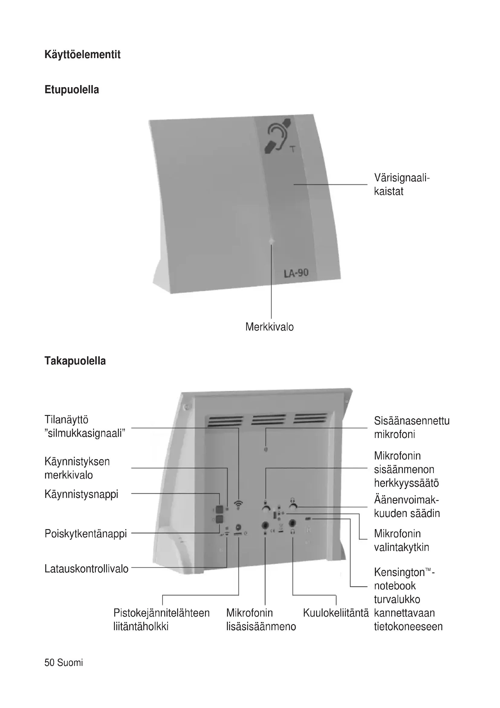 LA-90 « tallentaa sisäanasennetulla tai ulkoisella mikrofonilla äenet ja lahettää namä sisäanasennetulla silmukalla. Nämä lahetyt signaalit voidaan vastaanottaa kuulolaitteella, joka on asetetu asentoon "T" tai "MT".