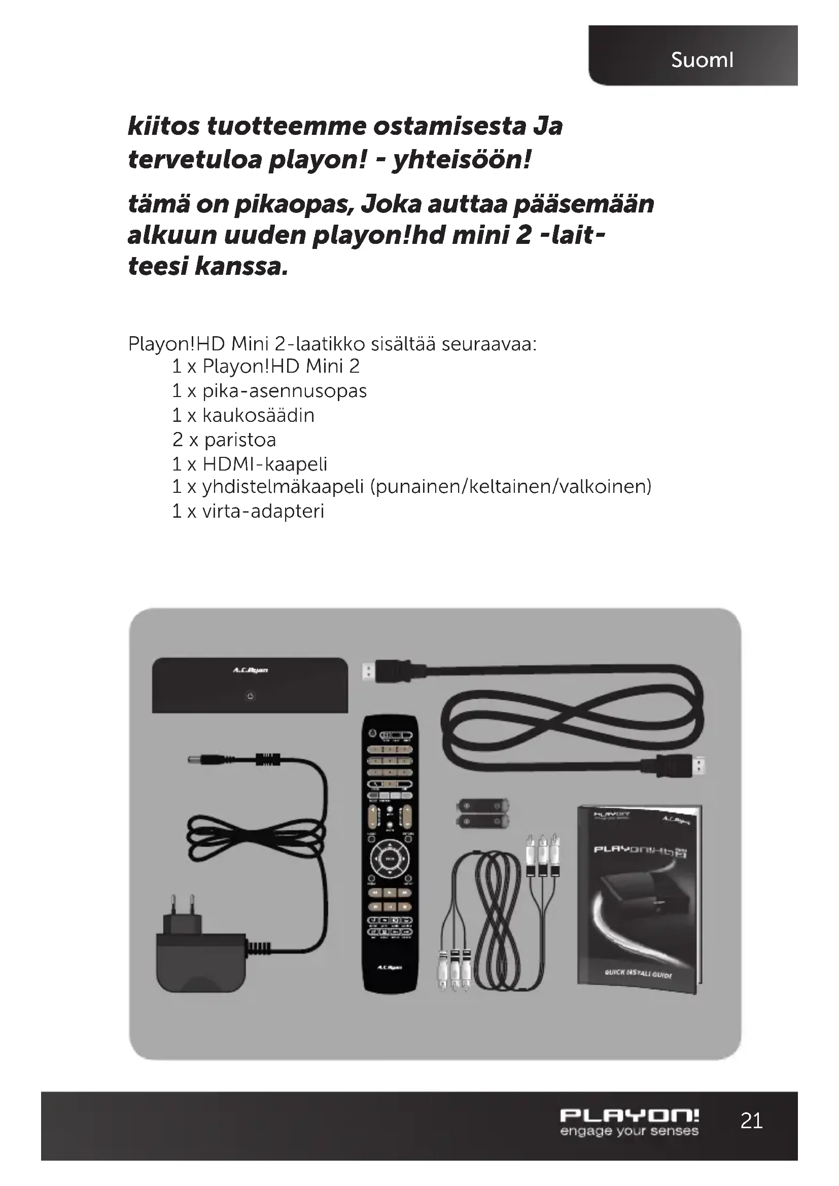 kokaapelilla tai langattomalla Playon!-verkkokortilla (kumpi- kaan ei sisälly pakkaukseen.) SuomI 22Alkuasetukset Valitse: Valikkokieli: valitse kieli, jota haluat käyttää. Verkkoasetukset: Jos olet liittänyt laitteeseen verkkokaapelin, valitse automaattinen tai kiinteä IP/DNS-osoite. Seuraa ohjeita ruudulta. Jos sinulla ei ole verkkokaapelia, jätä tämä kohta väliin. Kun olet suorittanut nämä alkuasetukset, Playon!HD Mini 2 soitti- mesi päävalikko ilmestyy näkyviin ja laite on valmis käytettäväksi. Käytä aikaa käydäksesi läpi Setup-valikko ja mukauta asetukset, joita haluat käyttää. Olet nyt valmis käyttämään Playon!HD Mini 2. Playon! Engage your senses. Muita vaihtoehtoja: Jos televisiossasi ei ole HDMI-liitäntää, voit käyttää mukana toimitettavaa komposiittikaapelia sekä videolle että audiolle, tai komponenttikaapelia (ei mukana) videolle ja komposiittikaapelia (punainen/valkoinen) audiolle. Jos sinulla on audio/video-vastaanotin, voit siirtää audio- ja videosignaalit sen kautta käyttämällä HDMI-, komposiitti-, komponentti- tai optista SPDIF TOSLINK -kaapelia. *** Optinen SPDIF TOSLINK kaapeli (ei mukana) tukee monika- navaääntä 5.1-järjestelmään asti. 7.1-monikanavaäänen hyvä HD-toisto vaatii HDMI-kaapelin. SuomI