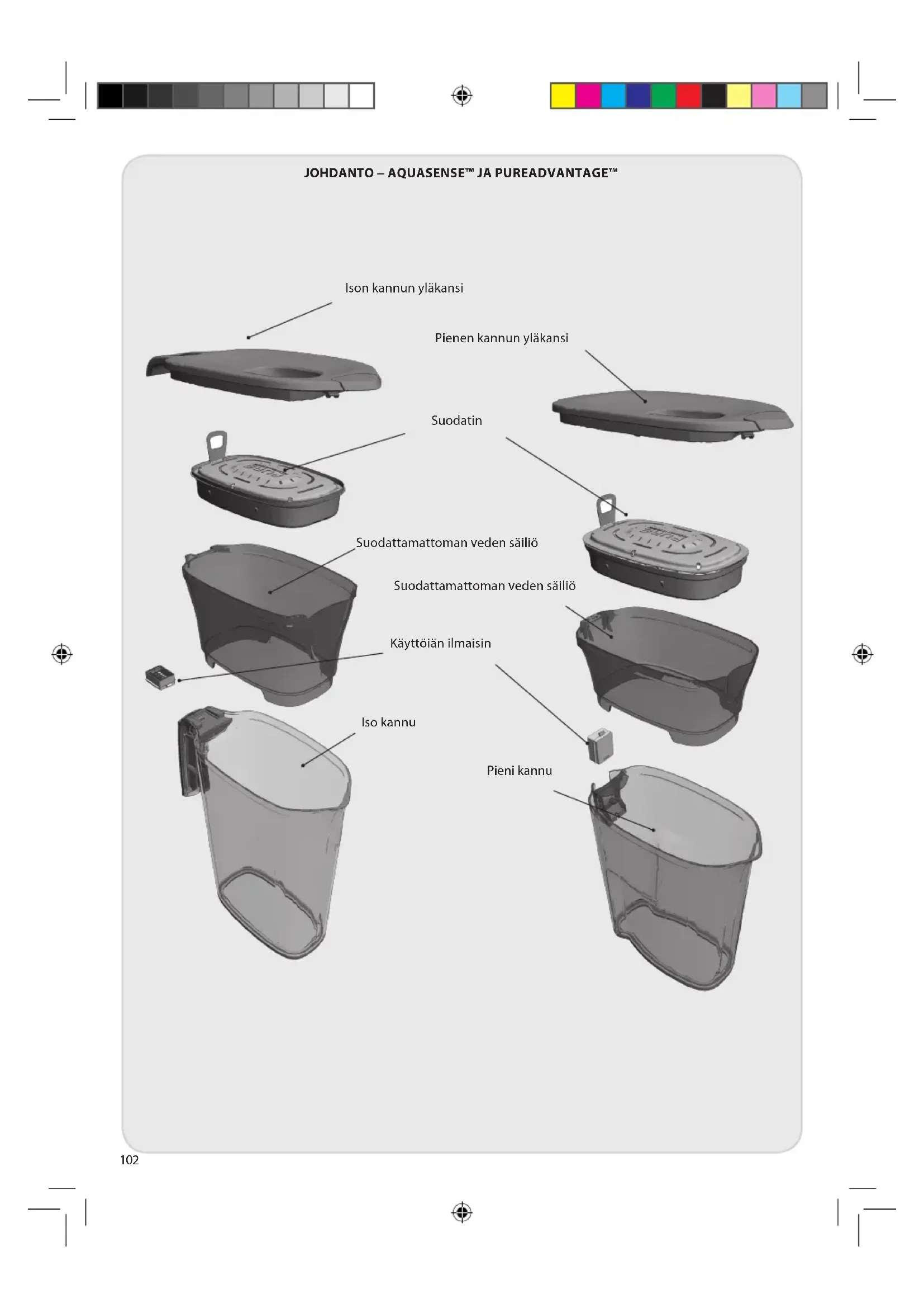 Kun otat uuden PUREADVANTAGE™-suodattimen käyttoän, havita aina kaksi ensimmäista suodatettua vesilitraa. - PUREADVANTAGE™-suodatintekníkka voi vähentä hanaveden tilapäistä kovuutta. Sen vuoksi sydānsairauksista kärsvien ja ohjattua ruokavaliota noudattavien henkilöiden on suositeltavaa keskustella läkarinsä kanssa ennen PUREADVANTAGE™-suodattimen kaytöä.