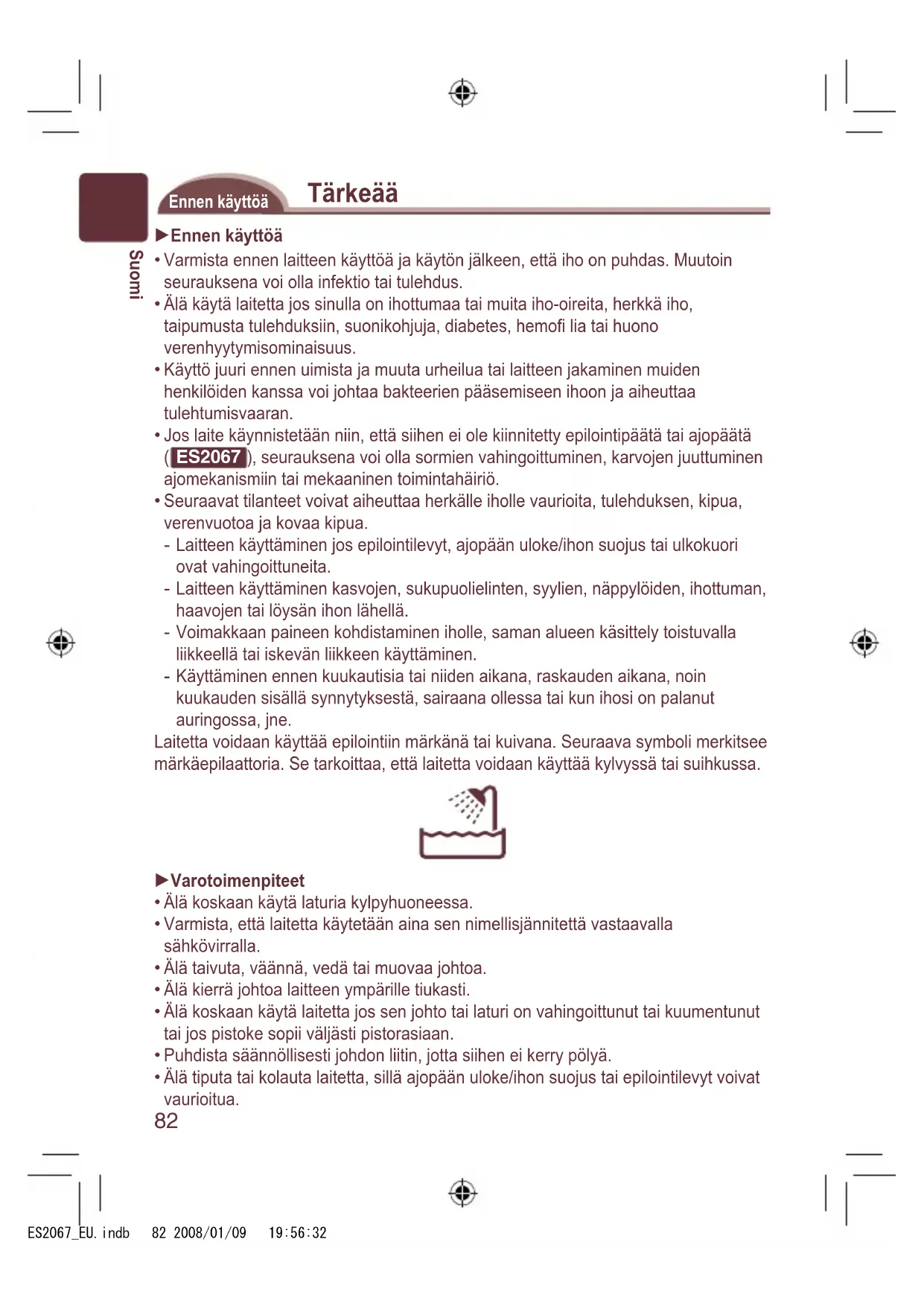 ES2067 ), seurauksena voi olla sormien vahingoittuminen, karvojen juuttuminen ajomekanismiin tai mekaaninen toimintahäiriö. Seuraavat tilanteet voivat aiheuttaa herkälle iholle vaurioita, tulehduksen, kipua, verenvuotoa ja kovaa kipua. Laitteen käyttäminen jos epilointilevyt, ajopään uloke/ihon suojus tai ulkokuori ovat vahingoittuneita. Laitteen käyttäminen kasvojen, sukupuolielinten, syylien, näppylöiden, ihottuman, haavojen tai löysän ihon lähellä. Voimakkaan paineen kohdistaminen iholle, saman alueen käsittely toistuvalla liikkeellä tai iskevän liikkeen käyttäminen. Käyttäminen ennen kuukautisia tai niiden aikana, raskauden aikana, noin kuukauden sisällä synnytyksestä, sairaana ollessa tai kun ihosi on palanut auringossa, jne. Laitetta voidaan käyttää epilointiin märkänä tai kuivana. Seuraava symboli merkitsee märkäepilaattoria. Se tarkoittaa, että laitetta voidaan käyttää kylvyssä tai suihkussa. Varotoimenpiteet Älä koskaan käytä laturia kylpyhuoneessa. Varmista, että laitetta käytetään aina sen nimellisjännitettä vastaavalla sähkövirralla. Älä taivuta, väännä, vedä tai muovaa johtoa. Älä kierrä johtoa laitteen ympärille tiukasti. Älä koskaan käytä laitetta jos sen johto tai laturi on vahingoittunut tai kuumentunut tai jos pistoke sopii väljästi pistorasiaan. Puhdista säännöllisesti johdon liitin, jotta siihen ei kerry pölyä. Älä tiputa tai kolauta laitetta, sillä ajopään uloke/ihon suojus tai epilointilevyt voivat vaurioitua.