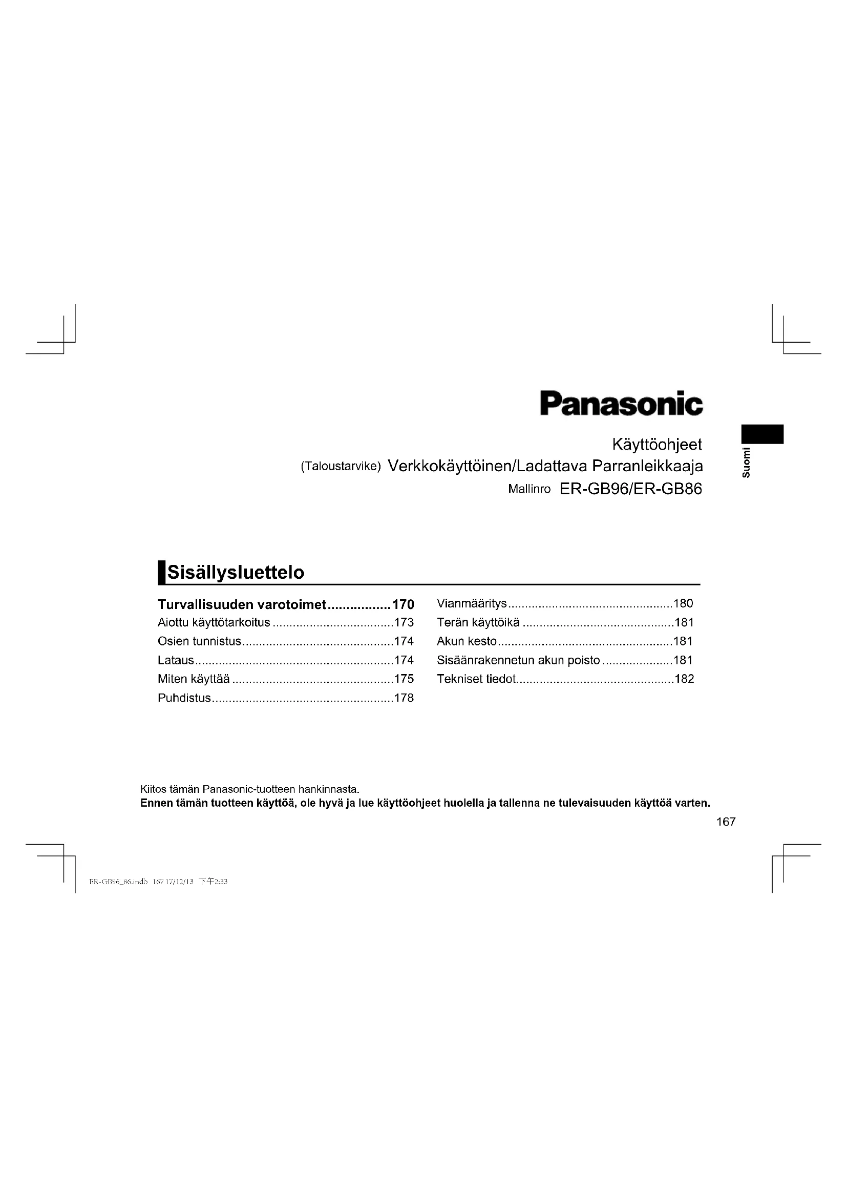 - Suosittelemme Panasonic -voiteluöljyä WES003P. ER-GB96_86.indb 179 17/12/13 下午2:33180 Suomi