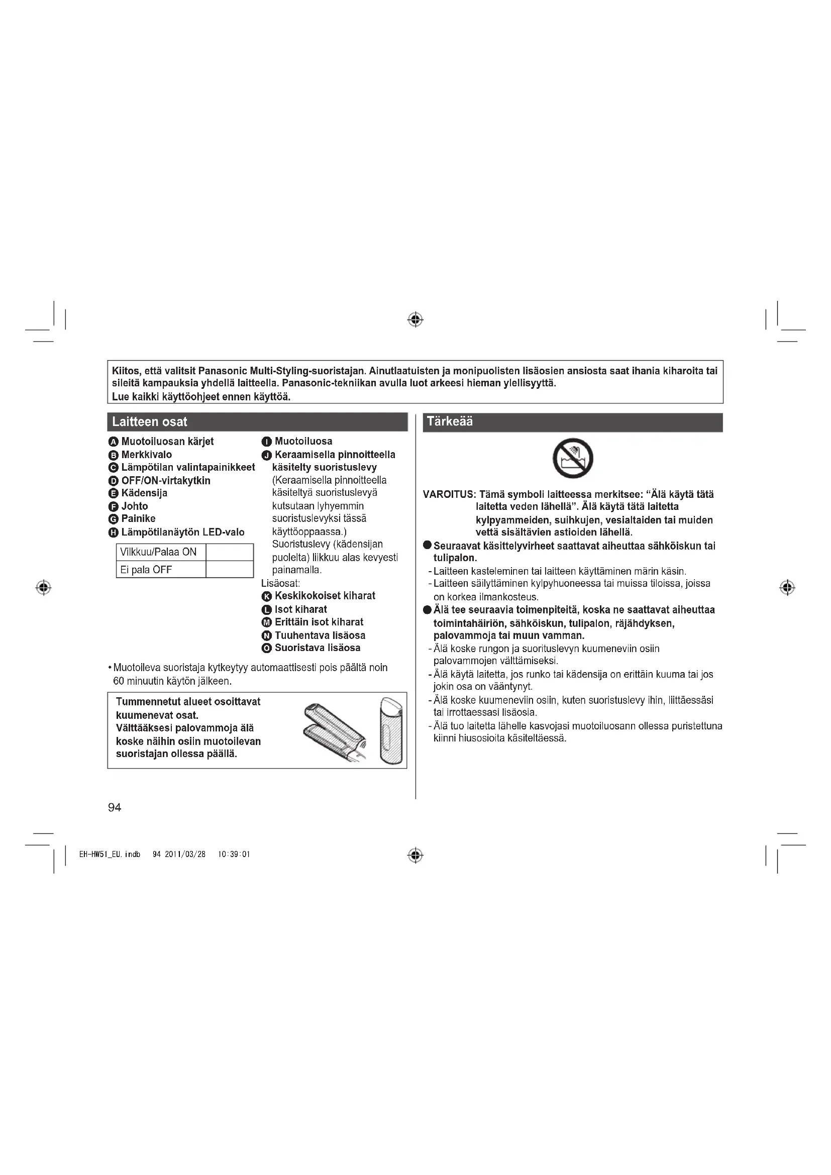 EH-HW51_EU.indb 93 2011/03/28 10:39:0194 Kiitos, että valitsit Panasonic Multi-Styling-suoristajan. Ainutlaatuisten ja monipuolisten lisäosien ansiosta saat ihania kiharoita tai sileitä kampauksia yhdellä laitteella. Panasonic-tekniikan avulla luot arkeesi hieman ylellisyyttä. Lue kaikki käyttöohjeet ennen käyttöä. Laitteen osat