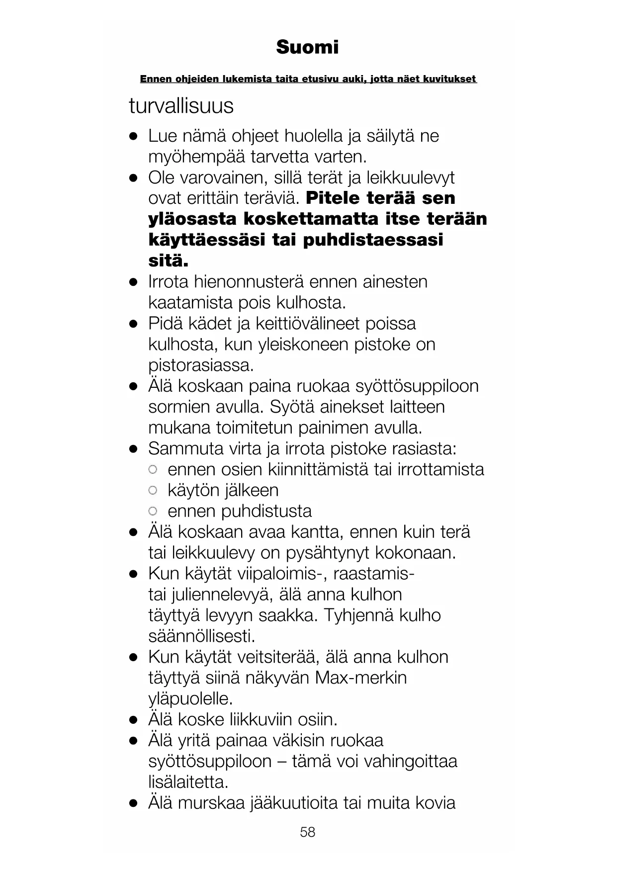 Ennen ohjeiden lukemista taita etusivu auki, jotta näet kuvitukset Suomiruoka-aineita, kuten mausteita, sillä ne voivat vaurioittaa lisälaitteen.