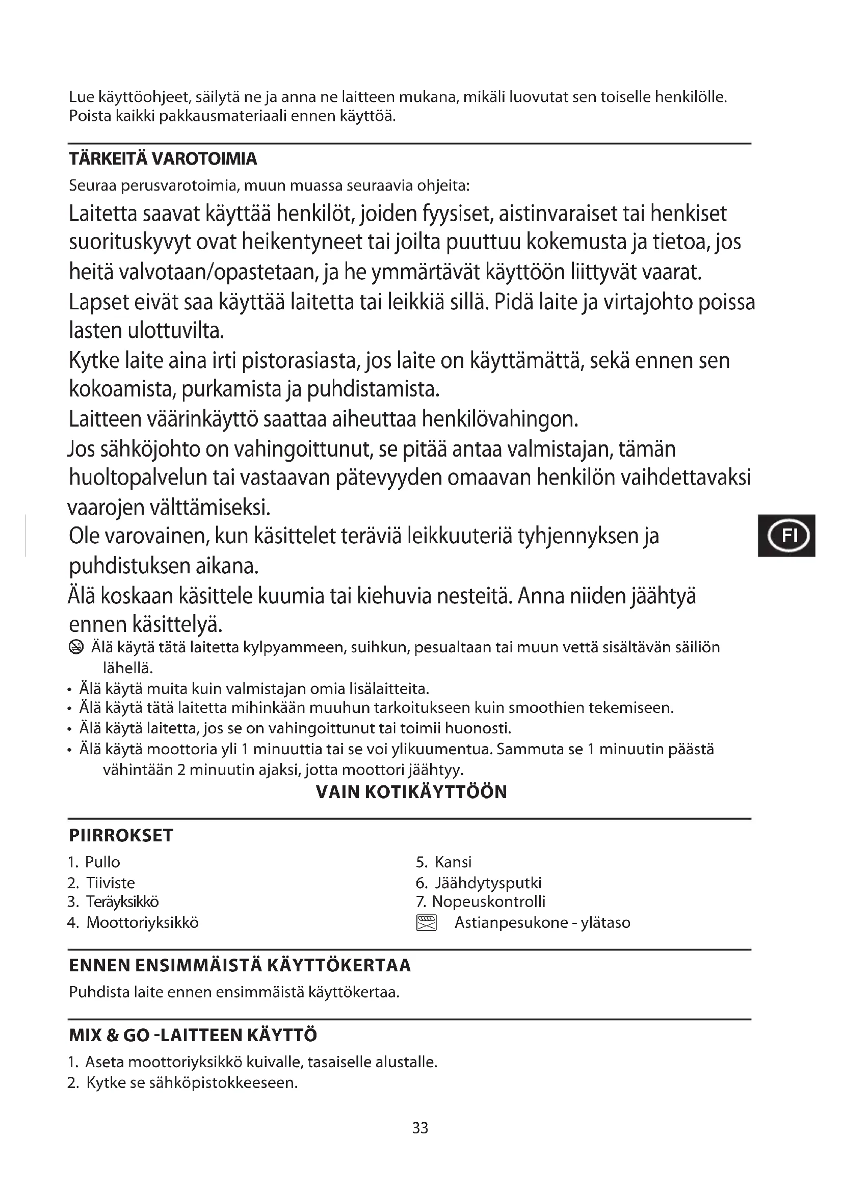 Seuraa perusvarotoimia, muun muassa seuraavia ohjeita: Laitetta saavat käyttää henkilöt, joiden fyysiset, aistinvaraiset tai henkiset suorituskyvyt ovat heikentyneet tai joilta puuttuu kokemusta ja tietoa, jos heitä valvotaan/opastetaan, ja he ymmärtävät käyttöön liittyvät vaarat. Lapset eivät saa käyttää laitetta tai leikkiä sillä. Pidä laite ja virtajohto poissa lasten ulottuvilta. Kytke laite aina irti pistorasiasta, jos laite on käyttämättä, sekä ennen sen kokoamista, purkamista ja puhdistamista. Laitteen väärinkäyttö saattaa aiheuttaa henkilövahingon. Jos sähköjohto on vahingoittunut, se pitää antaa valmistajan, tämän huoltopalvelun tai vastaavan pätevyyden omaavan henkilön vaihdettavaksi vaarojen välttämiseksi. Ole varovainen, kun käsittelet teräviä leikkuuteriä tyhjennyksen ja puhdistuksen aikana. Älä koskaan käsittele kuumia tai kiehuvia nesteitä. Anna niiden jäähtyä ennen käsittelyä. b Älä käytä tätä laitetta kylpyammeen, suihkun, pesualtaan tai muun vettä sisältävän säiliön lähellä.