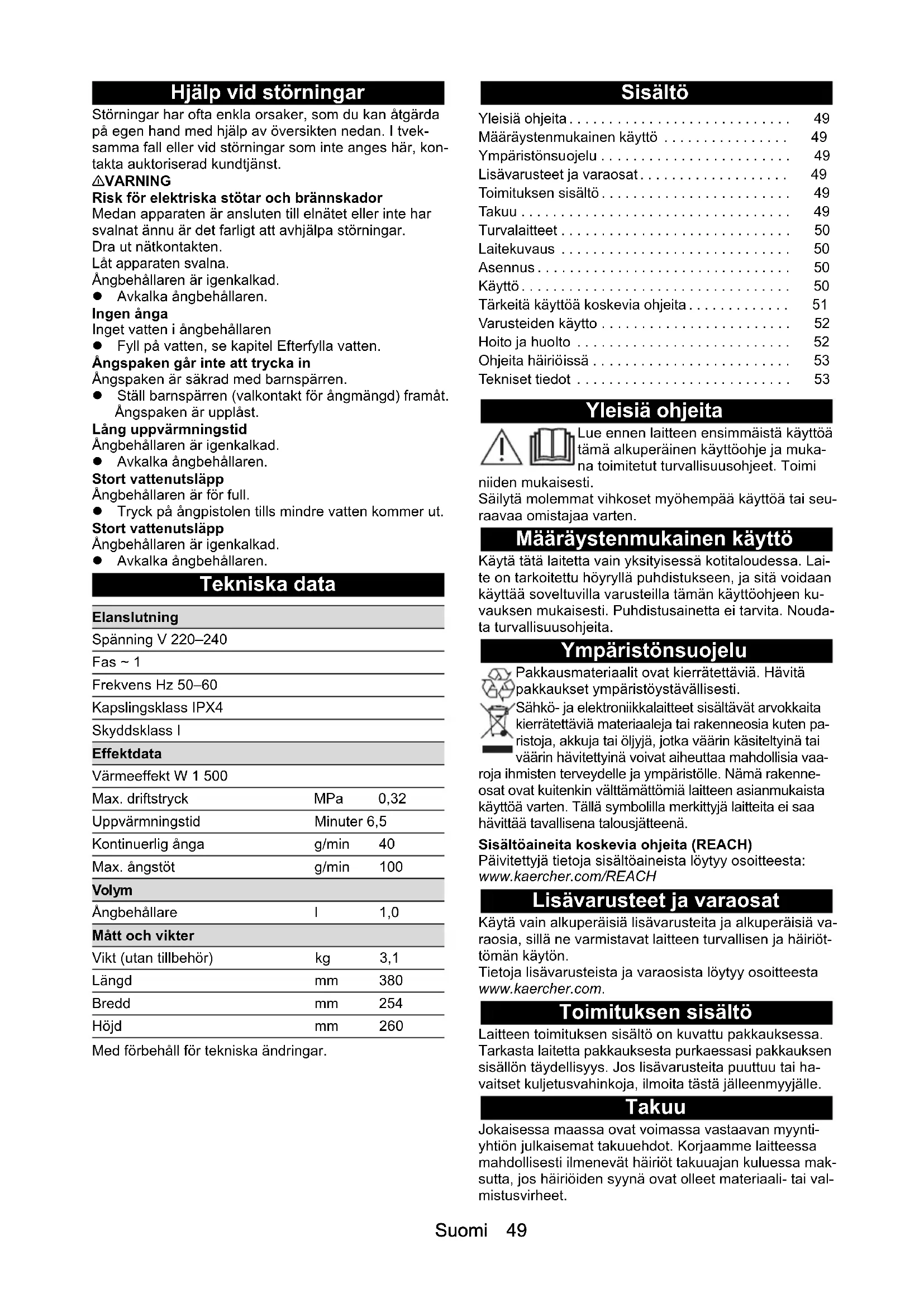 - tvättmaskinen. Hårdhet °dH mmol/l TF I mjukt 0-7 0-1,3 55 II medel 7-14 1,3-2,5 45 III hårt 14-21 2,5-3,8 35 IV mycket hårt >21 >3,8 25Suomi 49 Hjälp vid störningar Störningar har ofta enkla orsaker, som du kan åtgärda på egen hand med hjälp av översikten nedan. I tvek- samma fall eller vid störningar som inte anges här, kon- takta auktoriserad kundtjänst. 몇 VARNING Risk för elektriska stötar och brännskador Medan apparaten är ansluten till elnätet eller inte har svalnat ännu är det farligt att avhjälpa störningar. Dra ut nätkontakten. Låt apparaten svalna. Ångbehållaren är igenkalkad. Avkalka ångbehållaren. Ingen ånga Inget vatten i ångbehållaren Fyll på vatten, se kapitel Efterfylla vatten. Ångspaken går inte att trycka in Ångspaken är säkrad med barnspärren. Ställ barnspärren (valkontakt för ångmängd) framåt. Ångspaken är upplåst. Lång uppvärmningstid Ångbehållaren är igenkalkad. Avkalka ångbehållaren. Stort vattenutsläpp Ångbehållaren är för full. Tryck på ångpistolen tills mindre vatten kommer ut. Stort vattenutsläpp Ångbehållaren är igenkalkad. Avkalka ångbehållaren. Tekniska data Med förbehåll för tekniska ändringar. Sisältö Yleisiä ohjeita Lue ennen laitteen ensimmäistä käyttöä tämä alkuperäinen käyttöohje ja muka- na toimitetut turvallisuusohjeet. Toimi niiden mukaisesti. Säilytä molemmat vihkoset myöhempää käyttöä tai seu- raavaa omistajaa varten. Määräystenmukainen käyttö Käytä tätä laitetta vain yksityisessä kotitaloudessa. Lai- te on tarkoitettu höyryllä puhdistukseen, ja sitä voidaan käyttää soveltuvilla varusteilla tämän käyttöohjeen ku- vauksen mukaisesti. Puhdistusainetta ei tarvita. Nouda- ta turvallisuusohjeita. Ympäristönsuojelu Pakkausmateriaalit ovat kierrätettäviä. Hävitä pakkaukset ympäristöystävällisesti. Sähkö- ja elektroniikkalaitteet sisältävät arvokkaita kierrätettäviä materiaaleja tai rakenneosia kuten pa- ristoja, akkuja tai öljyjä, jotka väärin käsiteltyinä tai väärin hävitettyinä voivat aiheuttaa mahdollisia vaa- roja ihmisten terveydelle ja ympäristölle. Nämä rakenne- osat ovat kuitenkin välttämättömiä laitteen asianmukaista käyttöä varten. Tällä symbolilla merkittyjä laitteita ei saa hävittää tavallisena talousjätteenä. Sisältöaineita koskevia ohjeita (REACH) Päivitettyjä tietoja sisältöaineista löytyy osoitteesta: www.kaercher.com/REACH Lisävarusteet ja varaosat Käytä vain alkuperäisiä lisävarusteita ja alkuperäisiä va- raosia, sillä ne varmistavat laitteen turvallisen ja häiriöt- tömän käytön. Tietoja lisävarusteista ja varaosista löytyy osoitteesta www.kaercher.com. Toimituksen sisältö Laitteen toimituksen sisältö on kuvattu pakkauksessa. Tarkasta laitetta pakkauksesta purkaessasi pakkauksen sisällön täydellisyys. Jos lisävarusteita puuttuu tai ha- vaitset kuljetusvahinkoja, ilmoita tästä jälleenmyyjälle. Takuu Jokaisessa maassa ovat voimassa vastaavan myynti- yhtiön julkaisemat takuuehdot. Korjaamme laitteessa mahdollisesti ilmenevät häiriöt takuuajan kuluessa mak- sutta, jos häiriöiden syynä ovat olleet materiaali- tai val- mistusvirheet. Elanslutning Spänning V 220–240 Fas ~ 1 Frekvens Hz 50–60 Kapslingsklass IPX4 Skyddsklass I Effektdata Värmeeffekt W 1 500 Max. driftstryck MPa 0,32 Uppvärmningstid Minuter 6,5 Kontinuerlig ånga g/min 40 Max. ångstöt g/min 100 Volym Ångbehållare l 1,0 Mått och vikter Vikt (utan tillbehör) kg 3,1 Längd mm 380 Bredd mm 254 Höjd mm 260 Yleisiä ohjeita p. 49