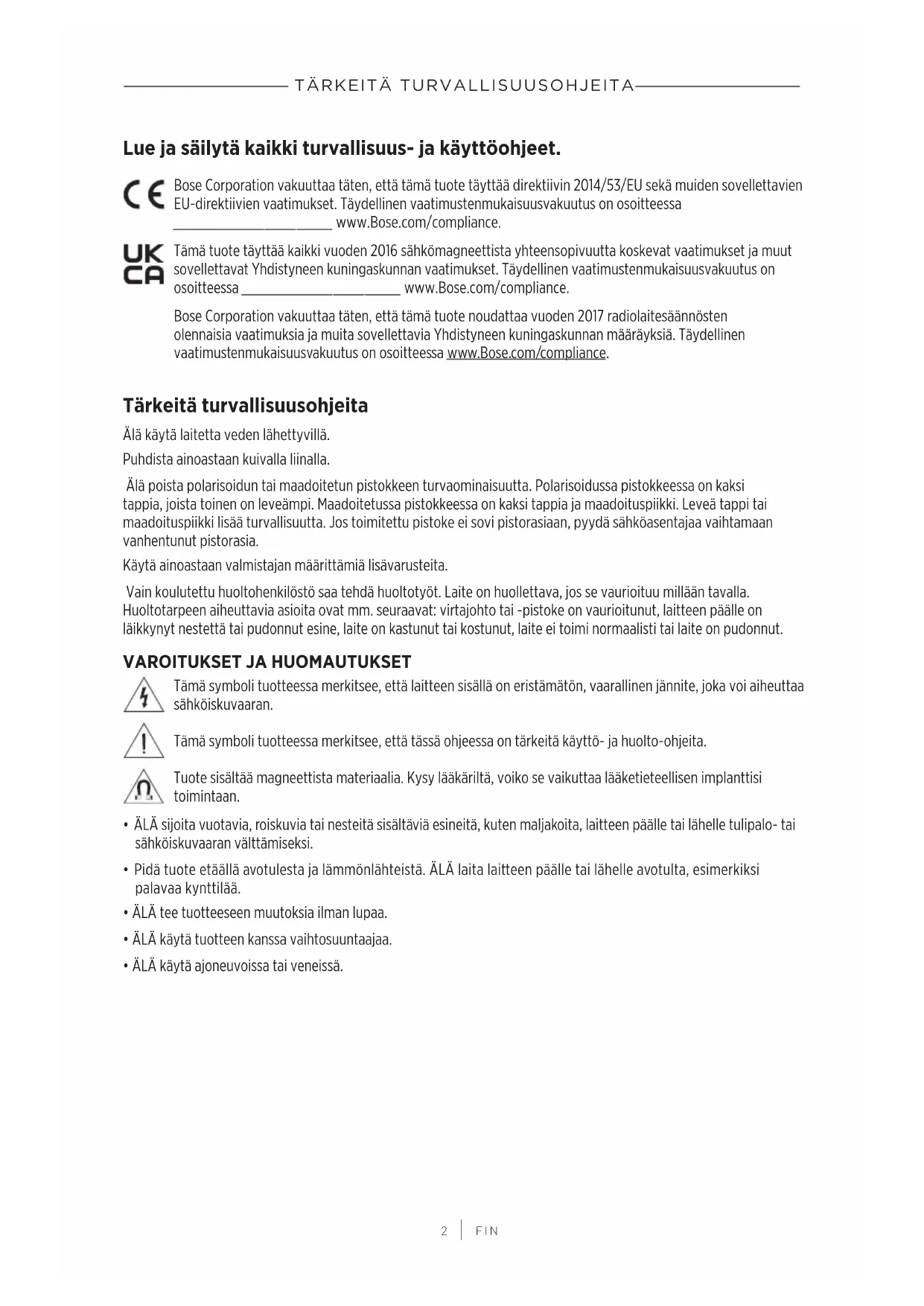 FIN Lue ja säilytä kaikki turvallisuus- ja käyttöohjeet. Bose Corporation vakuuttaa täten, että tämä tuote täyttää direktiivin 2014/53/EU sekä muiden sovellettavien EU-direktiivien vaatimukset. Täydellinen vaatimustenmukaisuusvakuutus on osoitteessa www.Bose.com/compliancewww.Bose.com/compliance. Tämä tuote täyttää kaikki vuoden2016 sähkömagneettista yhteensopivuutta koskevat vaatimukset ja muut sovellettavat Yhdistyneen kuningaskunnan vaatimukset. Täydellinen vaatimustenmukaisuusvakuutus on osoitteessa www.Bose.com/compliancewww.Bose.com/compliance. Bose Corporation vakuuttaa täten, että tämä tuote noudattaa vuoden2017 radiolaitesäännösten olennaisia vaatimuksia ja muita sovellettavia Yhdistyneen kuningaskunnan määräyksiä. Täydellinen vaatimustenmukaisuusvakuutus on osoitteessa www.Bose.com/compliancewww.Bose.com/compliance. Tärkeitä turvallisuusohjeita Älä käytä laitetta veden lähettyvillä. Puhdista ainoastaan kuivalla liinalla. Älä poista polarisoidun tai maadoitetun pistokkeen turvaominaisuutta. Polarisoidussa pistokkeessa on kaksi tappia, joista toinen on leveämpi. Maadoitetussa pistokkeessa on kaksi tappia ja maadoituspiikki. Leveä tappi tai maadoituspiikki lisää turvallisuutta. Jos toimitettu pistoke ei sovi pistorasiaan, pyydä sähköasentajaa vaihtamaan vanhentunut pistorasia. Käytä ainoastaan valmistajan määrittämiä lisävarusteita. Vain koulutettu huoltohenkilöstö saa tehdä huoltotyöt. Laite on huollettava, jos se vaurioituu millään tavalla. Huoltotarpeen aiheuttavia asioita ovat mm. seuraavat: virtajohto tai -pistoke on vaurioitunut, laitteen päälle on läikkynyt nestettä tai pudonnut esine, laite on kastunut tai kostunut, laite ei toimi normaalisti tai laite on pudonnut.