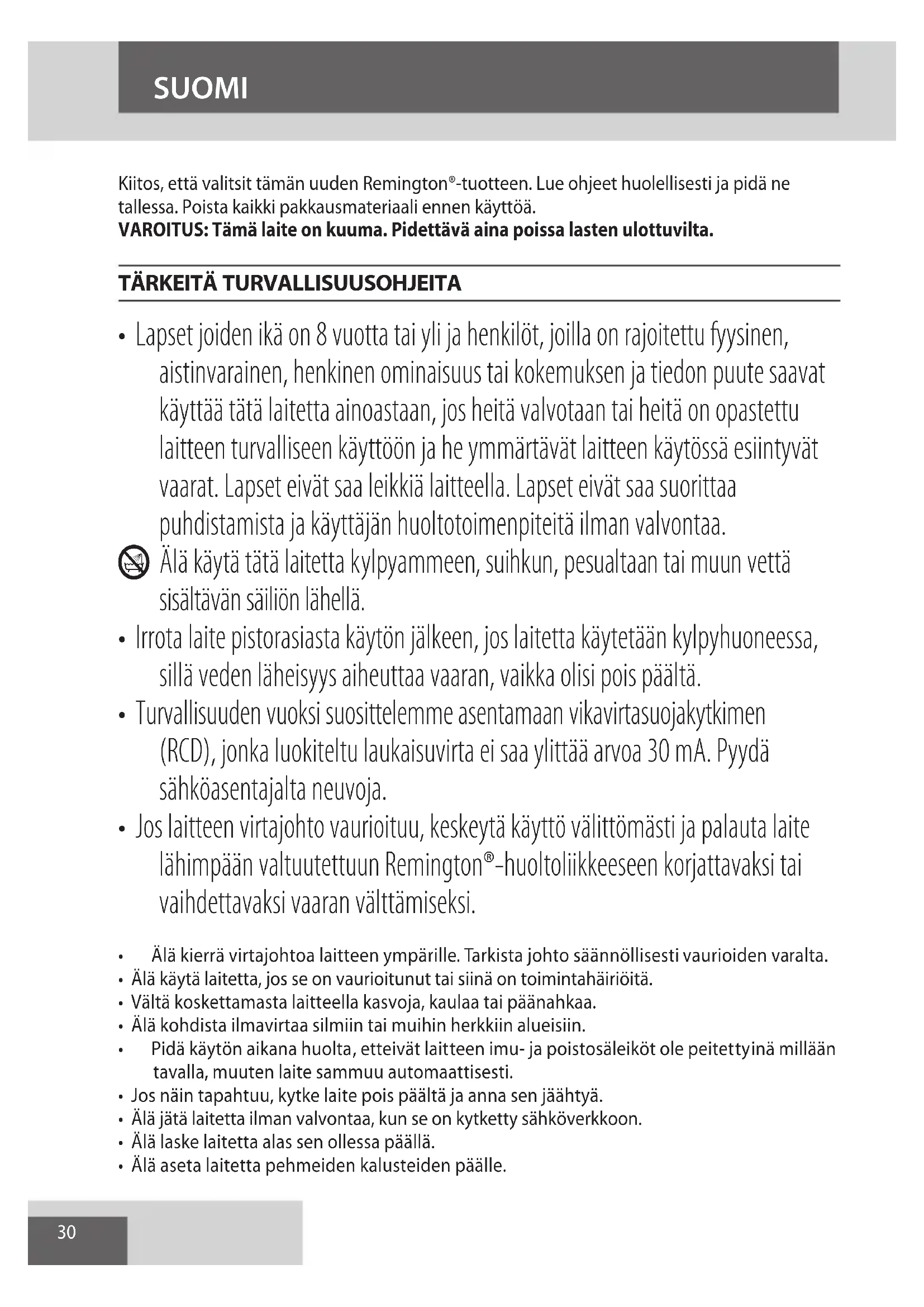 - Jos laitteen virtajohto vaurioituu, keskeytä käyttö välittömästi ja palauta laite lähimpään valtuutettuun Remington®-huoltoliikkeeseen korjattavaksi tai vaihdettavaksi vaaran välttämiseksi.