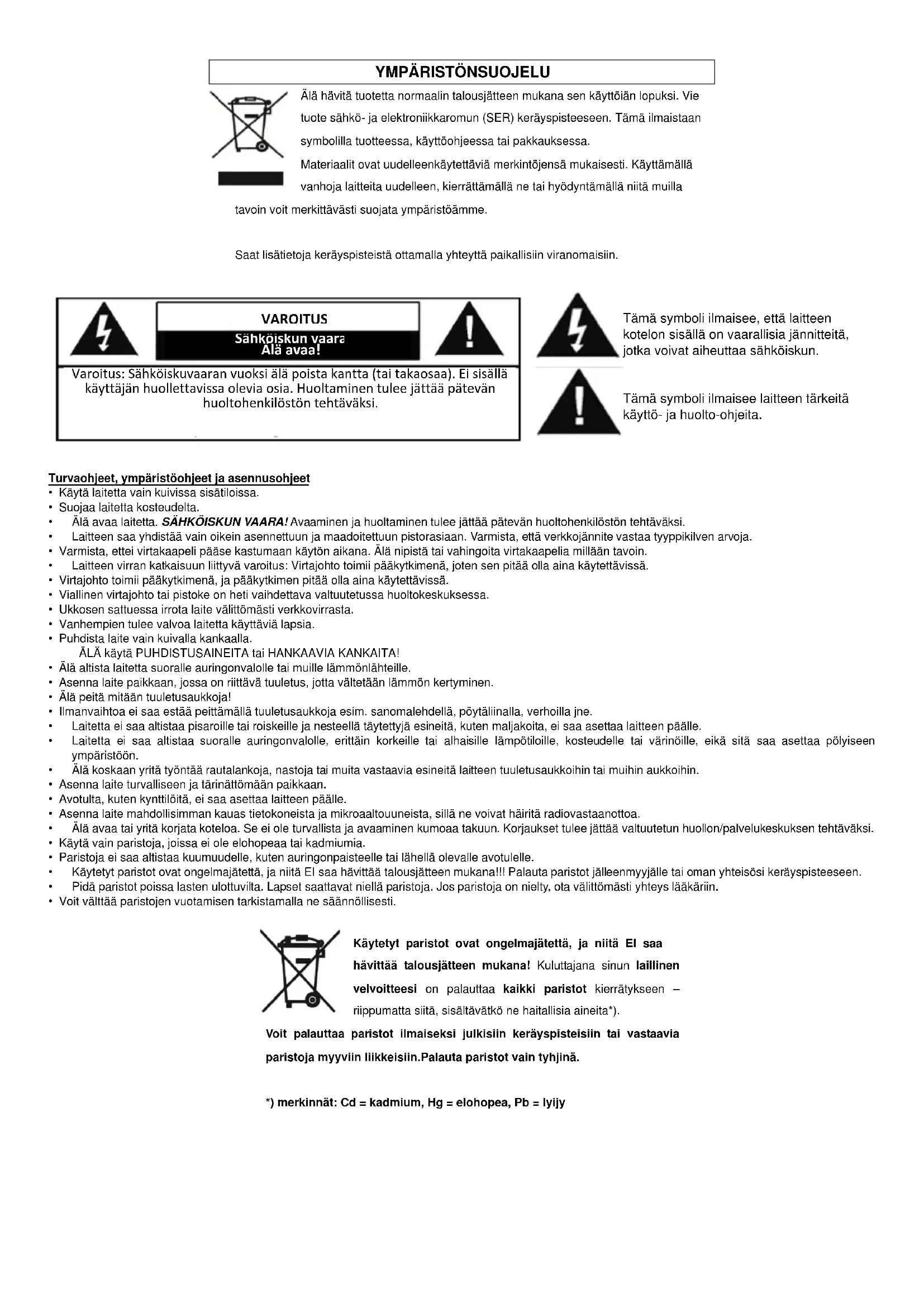 - Voit välttää paristojen vuotamisen tarkistamalla ne säännöllisesti. Käytetyt paristot ovat ongelmajätettä, ja niitä EI saa hävittää talousjätteen mukana! Kuluttajana sinun laillinen velvoitteesi on palauttaa kaikki paristot kierrätykseen – riippumatta siitä, sisältävätkö ne haitallisia aineita*). Voit palauttaa paristot ilmaiseksi julkisiin keräyspisteisiin tai vastaavia paristoja myyviin liikkeisiin.Palauta paristot vain tyhjinä. *) merkinnät: Cd = kadmium, Hg = elohopea, Pb = lyijy VAROITUS