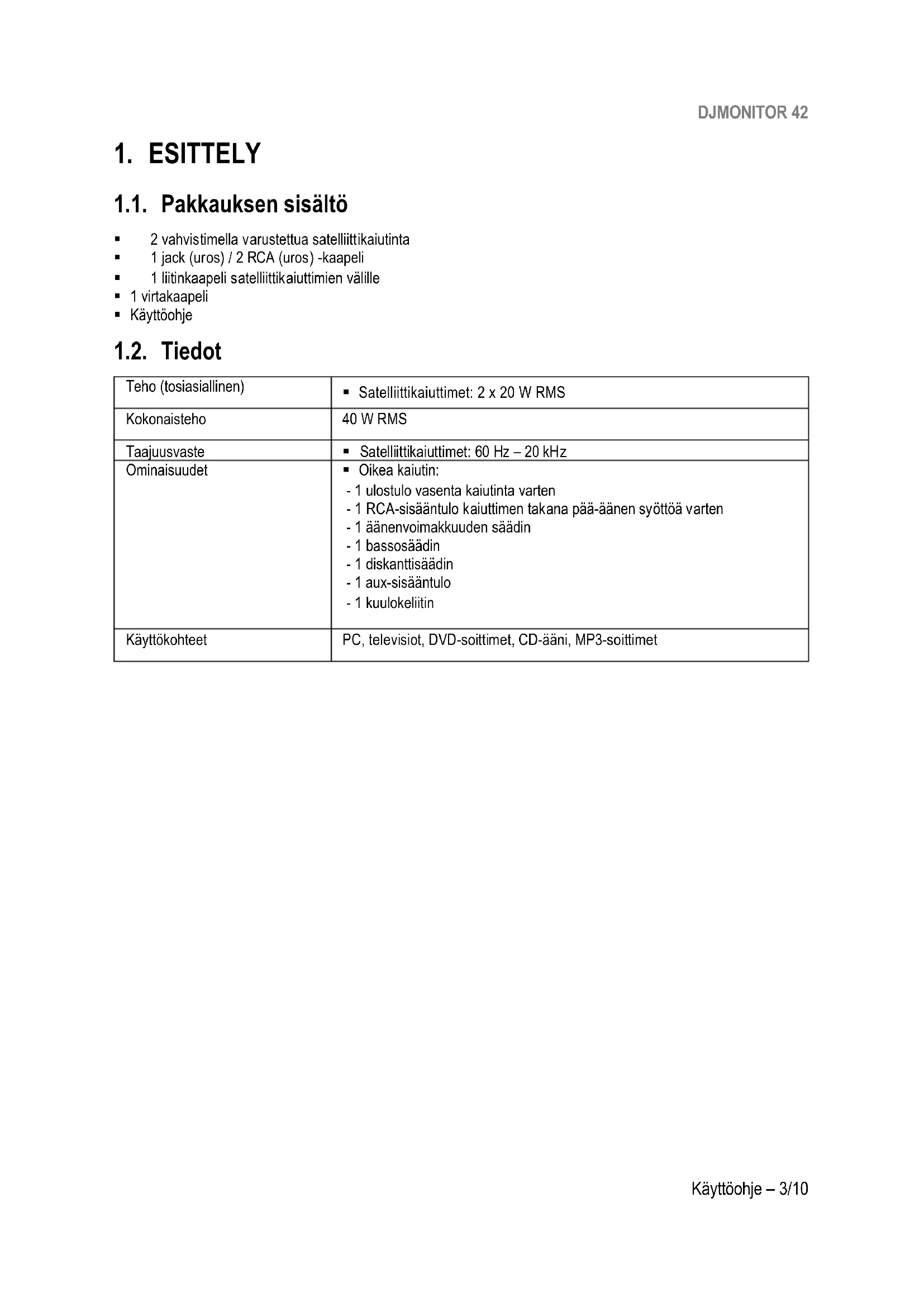 1.1. Pakkauksen sisältö 2 vahvistimella varustettua satelliittikaiutinta 1 jack (uros) / 2 RCA (uros) -kaapeli 1 liitinkaapeli satelliittikaiuttimien välille 1 virtakaapeli Käyttöohje 1.2. Tiedot Teho (tosiasiallinen) Satelliittikaiuttimet: 2 x 20 W RMS Kokonaisteho 40 W RMS Taajuusvaste Satelliittikaiuttimet: 60 Hz – 20 kHz Ominaisuudet Oikea kaiutin: - 1 ulostulo vasenta kaiutinta varten - 1 RCA-sisääntulo kaiuttimen takana pää-äänen syöttöä varten - 1 äänenvoimakkuuden säädin - 1 bassosäädin - 1 diskanttisäädin - 1 aux-sisääntulo - 1 kuulokeliitin Käyttökohteet PC, televisiot, DVD-soittimet, CD-ääni, MP3-soittimetDJMONITOR 42 4/10 – Käyttöohje 1.3. Suositukset - Aseta satelliittikaiuttimet tasaiselle pinnalle estääksesi niitä putoamasta. - Älä ikinä avaa kaiutinsettiä, sillä voit vahingoittaa sen sisäisiä komponentteja. - Tämä kaiutinsetti on tarkoitettu lauhkeaan ympäristöön. - Välttääksesi tulen tai sähköiskun riskiä pidä kaiutinsetti erossa: - sateesta tai kosteista paikoista, mukaan lukien nesteistä (vesi, kemialliset tuotteet tai muut nesteet), - lämmön lähteistä, kuten lämmityslaitteista, liesistä tai muista lämpöä tuottavista laitteista (mukaan lukien vahvistimet), - suorasta auringonvalosta. - Älä altista kaiutinsettiä vesipisaroille tai räiskeille. - Älä ikinä aseta nestettä sisältäviä astioita (lasi, maljakko...) kaiutinsetin päälle. - Irrota virtakaapeli, jos et aio käyttää kaiutinsettiä pitempään aikaan. Irrota virtakaapeli tarttumalla liittimeen ja vetämällä siitä, älä koskaan vedä johdosta. - Varmista, että kaiutinsetin pistokkeeseen liitetty virtajohto on helposti saatavilla. - Irrota kaiutinsetti ennen puhdistamista. Käytä kosteaa kangasta ja vältä käyttämästä aerosolilla täytettyjä puhdistimia. - Kaiutinsetin virtajohdolla laitteesta poistetaan virta, joten sen täytyy olla aina helposti saatavilla. - Huomautus: Kuulokkeiden pitempi kuunteluaika täydellä äänenvoimakkuudella saattaa vahingoittaa käyttäjän korvia ja kuuloa. - Merkinnät sijaitsevat kaiuttimien takana.