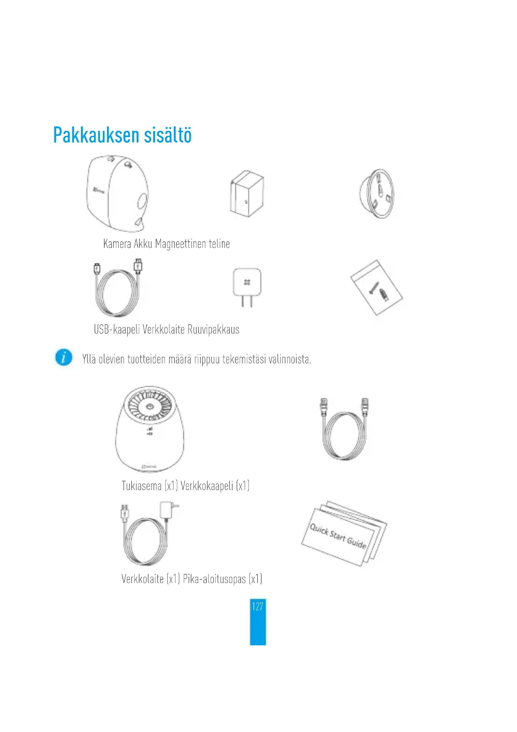 status for at formatere kortet. Status vil derefter ændres til Normal (Normal). Adgang til basestation via browser Du skal kigge efter et wi-fi-netværk på din mobilenhed ved navn "ezviz_xxxxxx" ,vælge netværket "ezviz_xxxxxx", indtaste wi-fi-adgangskoden ("wi-fi-navn"og "adgangskode" er angivet på enhedens mærkat) Hvis guiden ikke starter, kan du få adgang til den via webadressen wifi.ezvizlife.com i din Web-browser. Besøg www.ezvizlife.com for flere oplysninger.127 Pakkauksen sisältö Kamera Akku Magneettinen teline USB-kaapeli Verkkolaite Ruuvipakkaus Yllä olevien tuotteiden määrä riippuu tekemistäsi valinnoista. Tukiasema (x1) Verkkokaapeli (x1) Verkkolaite (x1) Pika-aloitusopas (x1)128 Tukiasema Nollaus -painike Virtapainike LAN-liitäntä WAN-liitäntä microSIM-korttipaikka MicroSD -korttipaikka QR-koodi Virtaliitäntä Akun merkkivalo Signaalin merkkivalo Pääpainike/päämerkkivalo Micro SDMicro SIM Nimi Kuvaus Päämerkkivalo