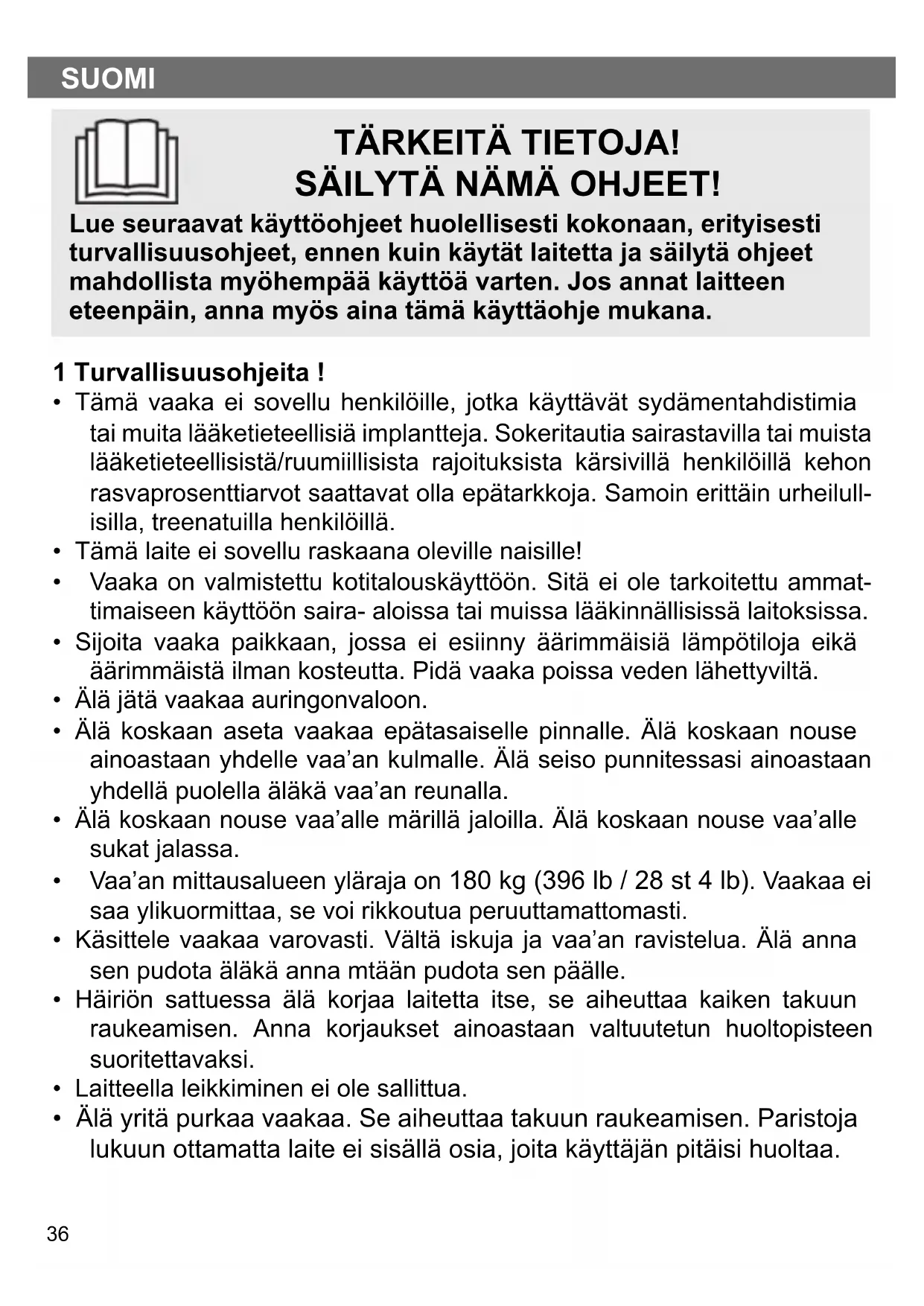 - Tämä vaaka ei sovellu henkilöille, jotka käyttävät sydämentahdistimia tai muita lääketieteellisiä implantteja. Sokeritautia sairastavilla tai muista lääketieteellisistä/ruumiillisista rajoituksista kärsivillä henkilöillä kehon rasvaprosenttiarvot saattavat olla epätarkkoja. Samoin erittäin urheilull- isilla, treenatuilla henkilöillä.