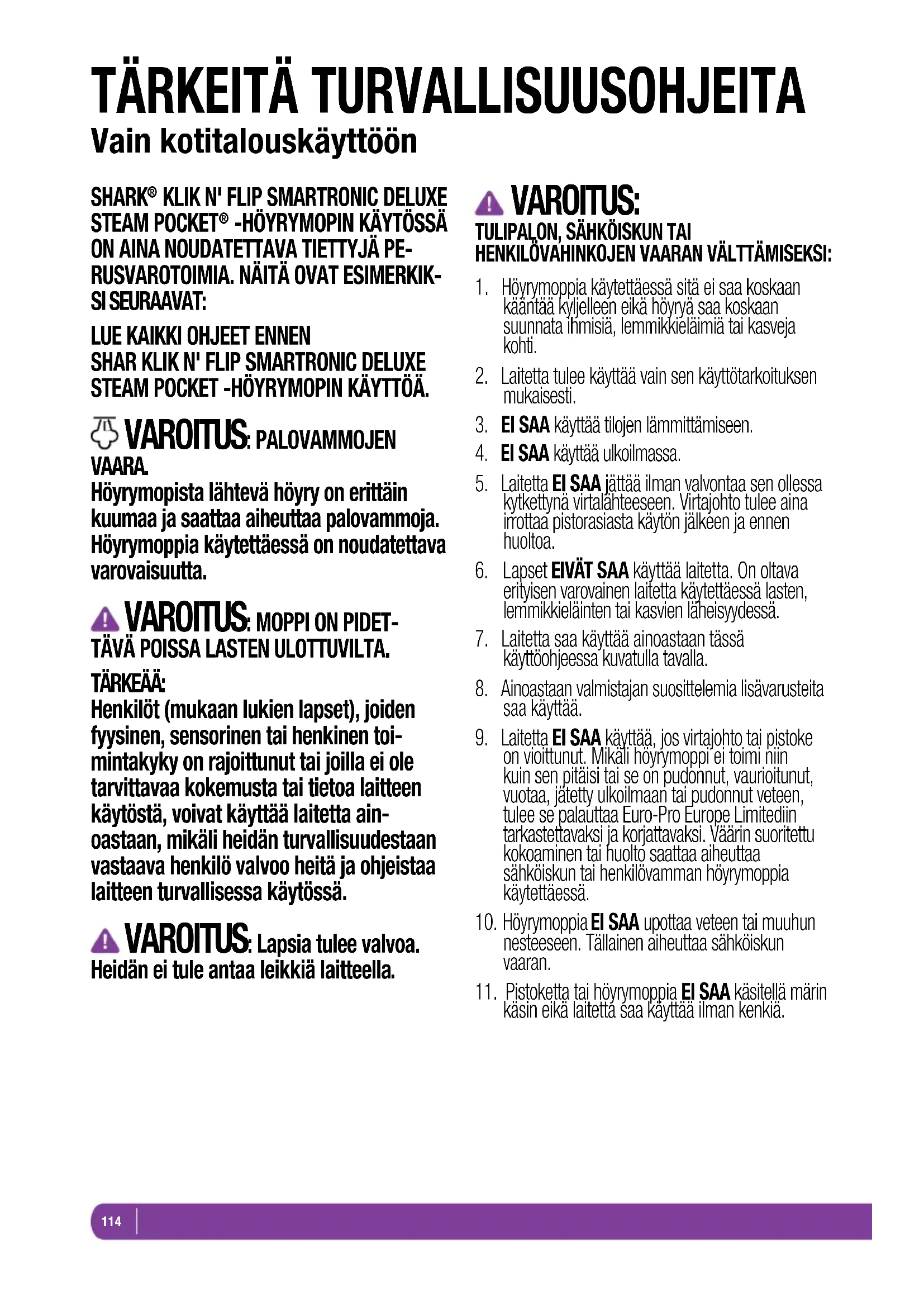 STEAM POCKET -HÖYRYMOPINKÄYTTÖÄ. VAROITUS: PALOVAMMOJEN VAARA. Höyrymopista lähtevä höyry on erittäin kuumaa ja saattaa aiheuttaa palovammoja. Höyrymoppia käytettäessä on noudatettava varovaisuutta. VAROITUS: MOPPIONPIDET- TÄVÄPOISSALASTENULOTTUVILTA. TÄRKEÄÄ: Henkilöt (mukaan lukien lapset), joiden fyysinen, sensorinen tai henkinen toi- mintakyky on rajoittunut tai joilla ei ole tarvittavaa kokemusta tai tietoa laitteen käytöstä, voivat käyttää laitetta ain- oastaan, mikäli heidän turvallisuudestaan vastaava henkilö valvoo heitä ja ohjeistaa laitteen turvallisessa käytössä. VAROITUS: Lapsia tulee valvoa. Heidän ei tule antaa leikkiä laitteella