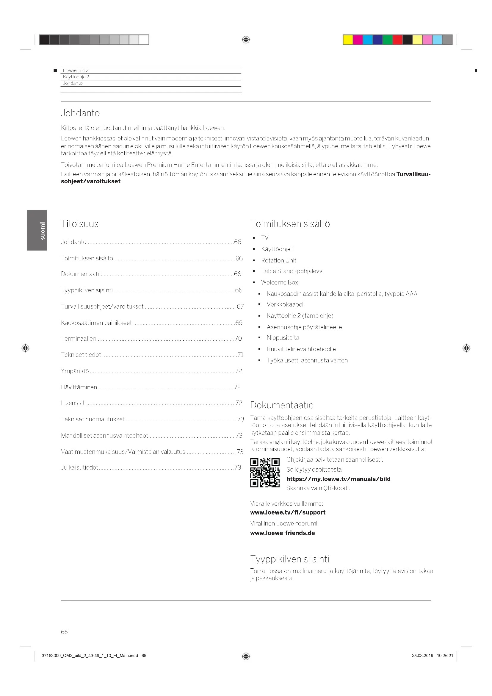 - Julkaisutiedot Dokumentaatio Tämä käyttöohjeen osa sisältää tärkeitä perustietoja. Laitteen käyt- töönotto ja asetukset tehdään intuitiivisella käyttöohjeella, kun laite kytketään päälle ensimmäistä kertaa. Tarkka englanti käyttöohje, joka kuvaa uuden Loewe-laitteesi toiminnot ja ominaisuudet, voidaan ladata sähköisesti Loewen verkkosivulta. Ohjekirjaa päivitetään säännöllisesti. Se löytyy osoitteesta https://my.loewe.tv/manuals/bild Skannaa vain QR-koodi. Vieraile verkkosivuillamme: www.loewe.tv/fi/support Virallinen Loewe-foorumi: www.loewe-friends.de Tyyppikilven sijainti Tarra, jossa on mallinumero ja käyttöjännite, löytyy television takaa ja pakkauksesta. 37163000_OM2_bild_2_43-49_1_10_FI_Main.indd 6637163000_OM2_bild_2_43-49_1_10_FI_Main.indd 66 25.03.2019 10:26:2125.03.2019 10:26:21Loewe bild 2 Käyttöohje 2 p. 73