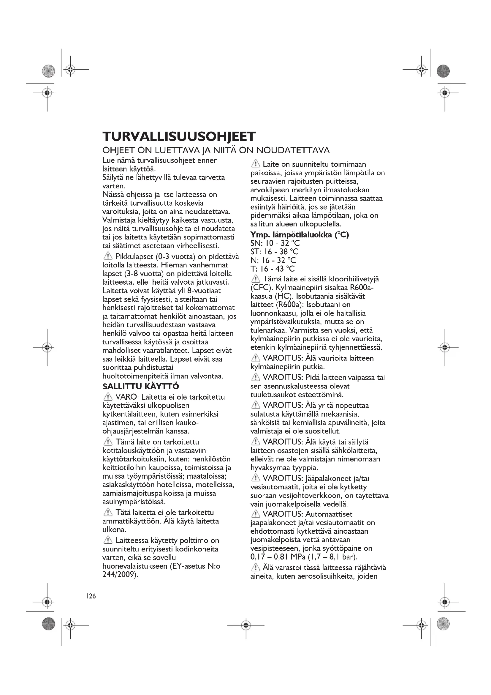 VARO: Laitetta ei ole tarkoitettu käytettäväksi ulkopuolisen kytkentälaitteen, kuten esimerkiksi ajastimen, tai erillisen kauko- ohjausjärjestelmän kanssa. Tämä laite on tarkoitettu kotitalouskäyttöö n ja vastaaviin käyttötarkoituksiin, kuten: henkilöstön keittiötiloihin kaupoissa, toimistoissa ja muissa työympäristöissä; maataloissa; asiakaskäyttöön hotelleissa, motelleissa, aamiaismajoituspaikoissa ja muissa asuinympäristöissä. Tätä laitetta ei ole tarkoitettu ammattikäyttöön. Älä käytä laitetta ulkona. Laitteessa käytetty polttimo on suunniteltu erityisesti kodinkoneita varten, eikä se sovellu huonevala istukseen (EY-asetus N:o 244/2009). Laite on suunniteltu toimimaan paikoissa, joissa ympäristön lämpötila on seuraavien rajoitusten puitteissa, arvokilpeen merkityn ilmastoluokan mukaisesti. Laitteen toiminnassa saattaa esiintyä häiriöitä, jos se jätetään pidemmäksi aikaa lämpötilaan, joka on sallitun alueen ulkopuolella. Ymp. lämpötilaluokka (°C) SN: 10 - 32 °C ST: 16 - 38 °C N: 16 - 32 °C T: 16 - 43 °C Tämä laite ei sisällä kloorihiilivetyjä (CFC). Kylmäainepiiri sisältää R600a- kaasua (HC). Isobutaania sisältävät laitteet (R600a): Isobutaani on luonnonkaasu, jolla ei ole haitallisia ympäristövaikutuksia, mutta se on tulenarkaa. Varmista sen vuoksi, että kylmäainepiirin putkissa ei ole vaurioita, etenkin kylmäainepiiriä tyhjennettäessä. VAROITUS: Älä vaurioita laitteen kylmäainepiirin putkia. VAROITUS: Pidä laitteen vaipassa tai sen asennuskalusteessa olevat tuuletusaukot esteettöminä. VAROITUS: Älä yritä nopeuttaa sulatusta käyttämällä mekaanisia, sähköisiä tai kemiallisia apuvälineitä, joita valmistaja ei ole suositellut. VAROITUS: Älä käytä tai säilytä laitteen osastojen sisällä sähkölaitteita, elleivät ne ole valmistajan nimenomaan hyväksymää tyyppiä. VAROITUS: Jääpalakoneet ja/tai vesiautomaatit, joita ei ole kytket