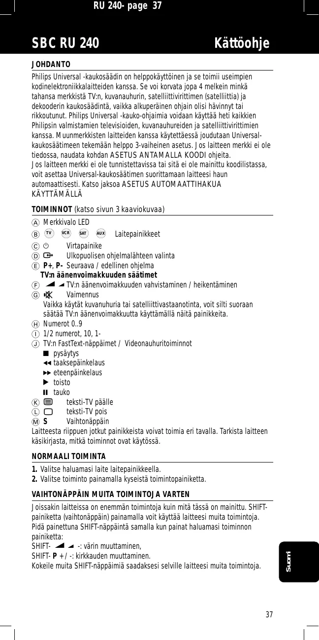 A B C D E Merkkivalo LED TV VCR SAT AUX Laitepainikkeet y Virtapainike † Ulkopuolisen ohjelmalähteen valinta P+, P- Seuraava / edellinen ohjelma TV:n äänenvoimakkuuden säätimet F TV:n äänenvoimakkuuden vahvistaminen / heikentäminen G c Vaimennus Vaikka käytät kuvanuhuria tai satelliittivastaanotinta, voit silti suoraan säätää TV:n äänenvoimakkuutta käyttämällä näitä painikkeita. H Numerot 0..9 I 1/2 numerot, 10, 1J TV:n FastText-näppäimet / Videonauhuritoiminnot 9 pysäytys 5 taaksepäinkelaus 6 eteenpäinkelaus 2 toisto ; tauko K b teksti-TV päälle L I teksti-TV pois M S Vaihtonäppäin Laitteesta riippuen jotkut painikkeista voivat toimia eri tavalla. Tarkista laitteen käsikirjasta, mitkä toiminnot ovat käytössä.