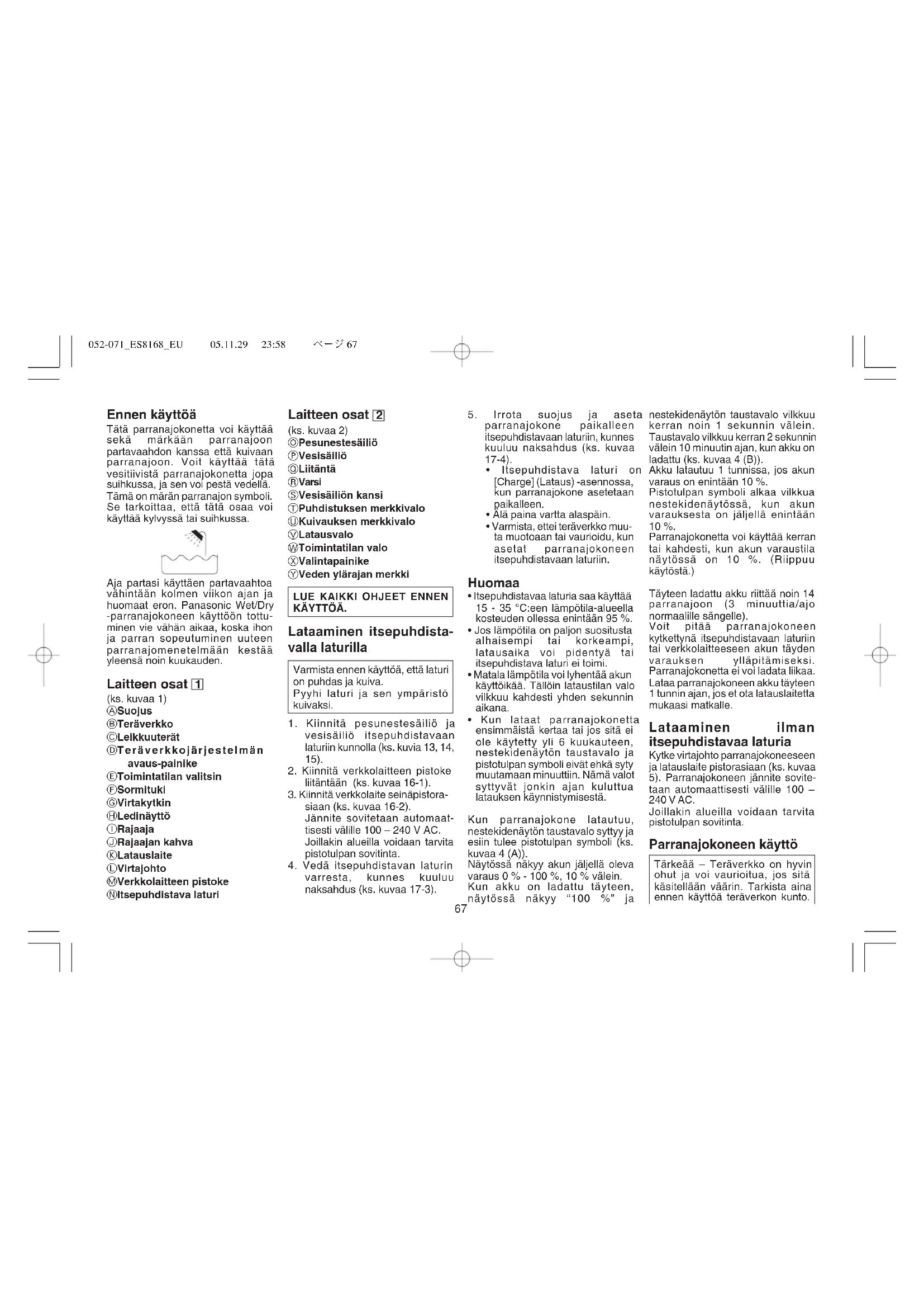Ennen käyttöä Tätä parranajokonetta voi käyttää sekä märkään parranajoon partavaahdon kanssa että kuivaan parranajoon. Voit käyttää tätä vesitiivistä parranajokonetta jopa suihkussa, ja sen voi pestä vedellä. Tämä on märän parranajon symboli. Se tarkoittaa, että tätä osaa voi käyttää kylvyssä tai suihkussa. Aja partasi käyttäen partavaahtoa vähintään kolmen viikon ajan ja huomaat eron. Panasonic Wet/Dry -parranajokoneen käyttöön tottu- minen vie vähän aikaa, koska ihon ja parran sopeutuminen uuteen parranajomenetelmään kestää yleensä noin kuukauden. Laitteen osat 1 (ks. kuvaa 1) A Suojus B Teräverkko C Leikkuuterät D Teräverkkojärjestelmän avaus-painike E Toimintatilan valitsin F Sormituki G Virtakytkin H Ledinäyttö I Rajaaja J Rajaajan kahva K Latauslaite L Virtajohto M Verkkolaitteen pistoke N Itsepuhdistava laturi Laitteen osat 2 (ks. kuvaa 2) O Pesunestesäiliö P Vesisäiliö Q Liitäntä R Varsi S Vesisäiliön kansi T Puhdistuksen merkkivalo U Kuivauksen merkkivalo V Latausvalo W Toimintatilan valo X Valintapainike Y Veden ylärajan merkki