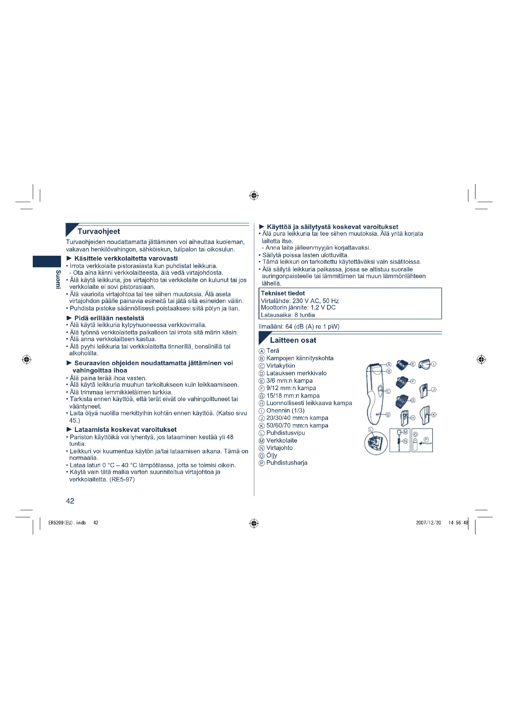 - Älä pidä leikkuria väärinpäin leikkauksen aikana. Tämä saattaa leikata hiuksia liikaa. 1Leikkaaminenilmankampaosia Kun leikkuria käytetään ilman kampaa, hiusten pituudeksi tulee 1 mm tai vähemmän. 1.Leikkaahiuksetpitämälläleikkurinpäätä suoraanpäänahkaavasten. 1Laitteenkäyttöverkkovirralla Jos yhdistät verkkolaitteen leikkuriin samalla tavalla kuin latausta vartenjasiirrätvirtakytkimenasentoon“1”,voitkäyttäälaitetta,vaikka paristot olisivat vähissä.•Josleikkurieitoimi,siirräkytkinasentoon“0•charge”,odotanoin1minuuttijasiirräkytkintakaisinasentoon“1”.•Äläjätäkytkintäasentoon“1”niin,ettäparistottyhjenevätkokonaan.Tämälyhentääparistonkäyttöikää. ER5209(EU).indb 44 2007/12/20 14:56:50Suomi