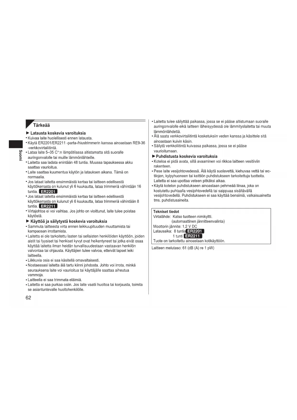 Laitetta tulee säilyttää paikassa, jossa se ei pääse altistumaan suoralle auringonvalolle eikä laitteen läheisyydessä ole lämmityslaitetta tai muuta lämmönlähdettä. Älä saata verkkovirtaliitintä kosketuksiin veden kanssa ja käsittele sitä ainoastaan kuivin käsin. Säilytä verkkoliitintä kuivassa paikassa, jossa se ei pääse vaurioitumaan. Puhdistusta koskevia varoituksia Koteloa ei pidä avata, sillä avaaminen voi rikkoa laitteen vesitiiviin rakenteen. Pese laite vesijohtovedessä. Älä käytä suolavettä, kiehuvaa vettä tai wc‑ tilojen, kylpyhuoneen tai keittiön puhdistukseen tarkoitettuja tuotteita. Laitetta ei saa upottaa veteen pitkäksi aikaa. Käytä kotelon puhdistukseen ainoastaan pehmeää liinaa, joka on kostutettu puhtaalla vesijohtovedellä tai saippuaa sisältävällä vesijohtovedellä. Puhdistukseen ei saa käyttää bensiiniä, valkaisuainetta tms. puhdistusaineita. Tekniset tiedot Virtalähde: Katso tuotteen nimikyltti. (automaattinen jännitteenvalinta) Moottorin jännite: 1,2 V DC Latausaika: 8 tuntia ER2201 1 tunti ER2211 Tuote on tarkoitettu ainoastaan kotikäyttöön. Laitteen melutaso: 61 (dB (A) re 1 pW)