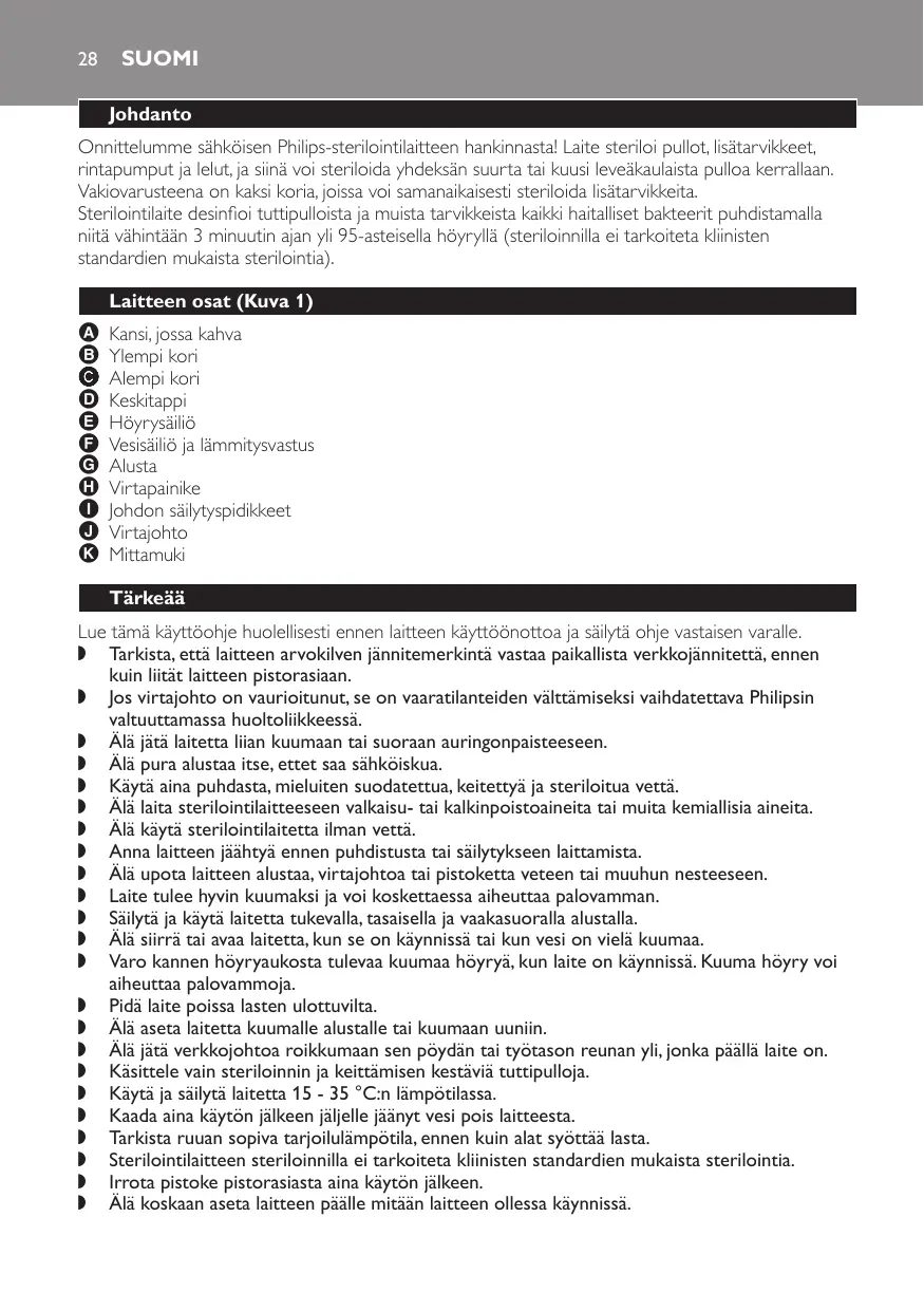 Kansi, jossa kahva Ylempi kori Alempi kori Keskitappi Höyrysäiliö Vesisäiliö ja lämmitysvastus Alusta Virtapainike Johdon säilytyspidikkeet Virtajohto Mittamuki Tärkeää Lue tämä käyttöohje huolellisesti ennen laitteen käyttöönottoa ja säilytä ohje vastaisen varalle. , Tarkista, että laitteen arvokilven jännitemerkintä vastaa paikallista verkkojännitettä, ennen kuin liität laitteen pistorasiaan. , Jos virtajohto on vaurioitunut, se on vaaratilanteiden välttämiseksi vaihdatettava Philipsin valtuuttamassa huoltoliikkeessä. , Älä jätä laitetta liian kuumaan tai suoraan auringonpaisteeseen. , Älä pura alustaa itse, ettet saa sähköiskua. , Käytä aina puhdasta, mieluiten suodatettua, keitettyä ja steriloitua vettä. , Älä laita sterilointilaitteeseen valkaisu- tai kalkinpoistoaineita tai muita kemiallisia aineita. , Älä käytä sterilointilaitetta ilman vettä. , Anna laitteen jäähtyä ennen puhdistusta tai säilytykseen laittamista. , Älä upota laitteen alustaa, virtajohtoa tai pistoketta veteen tai muuhun nesteeseen. , Laite tulee hyvin kuumaksi ja voi koskettaessa aiheuttaa palovamman. , Säilytä ja käytä laitetta tukevalla, tasaisella ja vaakasuoralla alustalla. , Älä siirrä tai avaa laitetta, kun se on käynnissä tai kun vesi on vielä kuumaa. , Varo kannen höyryaukosta tulevaa kuumaa höyryä, kun laite on käynnissä. Kuuma höyry voi aiheuttaa palovammoja. , Pidä laite poissa lasten ulottuvilta. , Älä aseta laitetta kuumalle alustalle tai kuumaan uuniin. , Älä jätä verkkojohtoa roikkumaan sen pöydän tai työtason reunan yli, jonka päällä laite on. , Käsittele vain steriloinnin ja keittämisen kestäviä tuttipulloja. , Käytä ja säilytä laitetta 15 - 35 °C:n lämpötilassa. , Kaada aina käytön jälkeen jäljelle jäänyt vesi pois laitteesta. , Tarkista ruuan sopiva tarjoilulämpötila, ennen kuin alat syöttää lasta. , Sterilointilaitteen steriloinnilla ei tarkoiteta kliinisten standardien mukaista sterilointia. , Irrota pistoke pistorasiasta aina käytön jälkeen. , Älä koskaan aseta laitteen päälle mitään laitteen ollessa käynnissä. Suomi 29 Automaattinen virrankatkaisu Elektroninen virrankatkaisutoiminto katkaisee laitteen virran automaattisesti 10 minuutin kuluttua, kun sterilointiohjelma on päättynyt. Käyttöönotto 1 Puhdista irrotettavat osat (katso kohtaa Puhdistaminen). 2 Voit säätää virtajohdon pituutta kiertämällä osan johdosta laitteen alustassa olevien pidikkeiden ympärille. 3 Työnnä pistoke pistorasiaan. Käyttöönotto Vesisäiliön täyttäminen 1 Irrota höyrysäiliö alustasta 2 Ota mittamukiin tarvittava määrä vettä (90 ml). Käytä vettä vähintään 90 ml, ettei vesi pääse kiehumaan kuiviin. 3 Kaada vesi vesisäiliöön (lämpövastuksen päälle). (Kuva 2) 4 Aseta höyrysäiliö alustan päälle. (Kuva 3) Käyttö Sterilointi 1 Pese kaikki steriloitavat esineet. 2 Tarkista, että vesisäiliössä on tarpeeksi vettä (katso kohtaa Käyttöönotto).