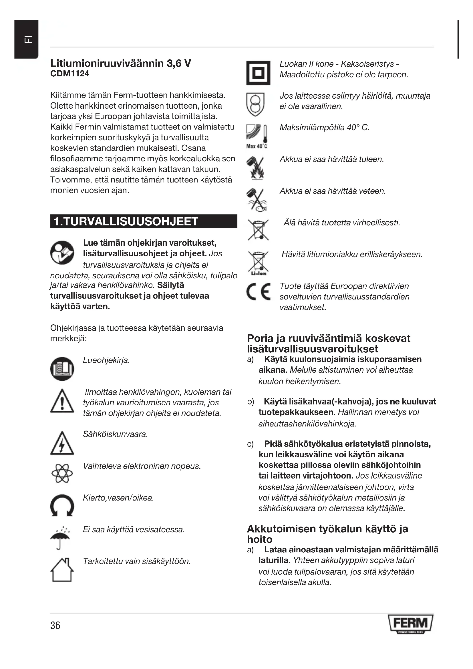 Litiumioniruuviväännin 3,6 V CDM1124 Kiitämme tämän Ferm-tuotteen hankkimisesta. Olette hankkineet erinomaisen tuotteen, jonka tarjoaa yksi Euroopan johtavista toimittajista. Kaikki Fermin valmistamat tuotteet on valmistettu korkeimpien suorituskykyä ja turvallisuutta koskevien standardien mukaisesti. Osana filosofiaamme tarjoamme myös korkealuokkaisen asiakaspalvelun sekä kaiken kattavan takuun. Toivomme, että nautitte tämän tuotteen käytöstä monien vuosien ajan.
