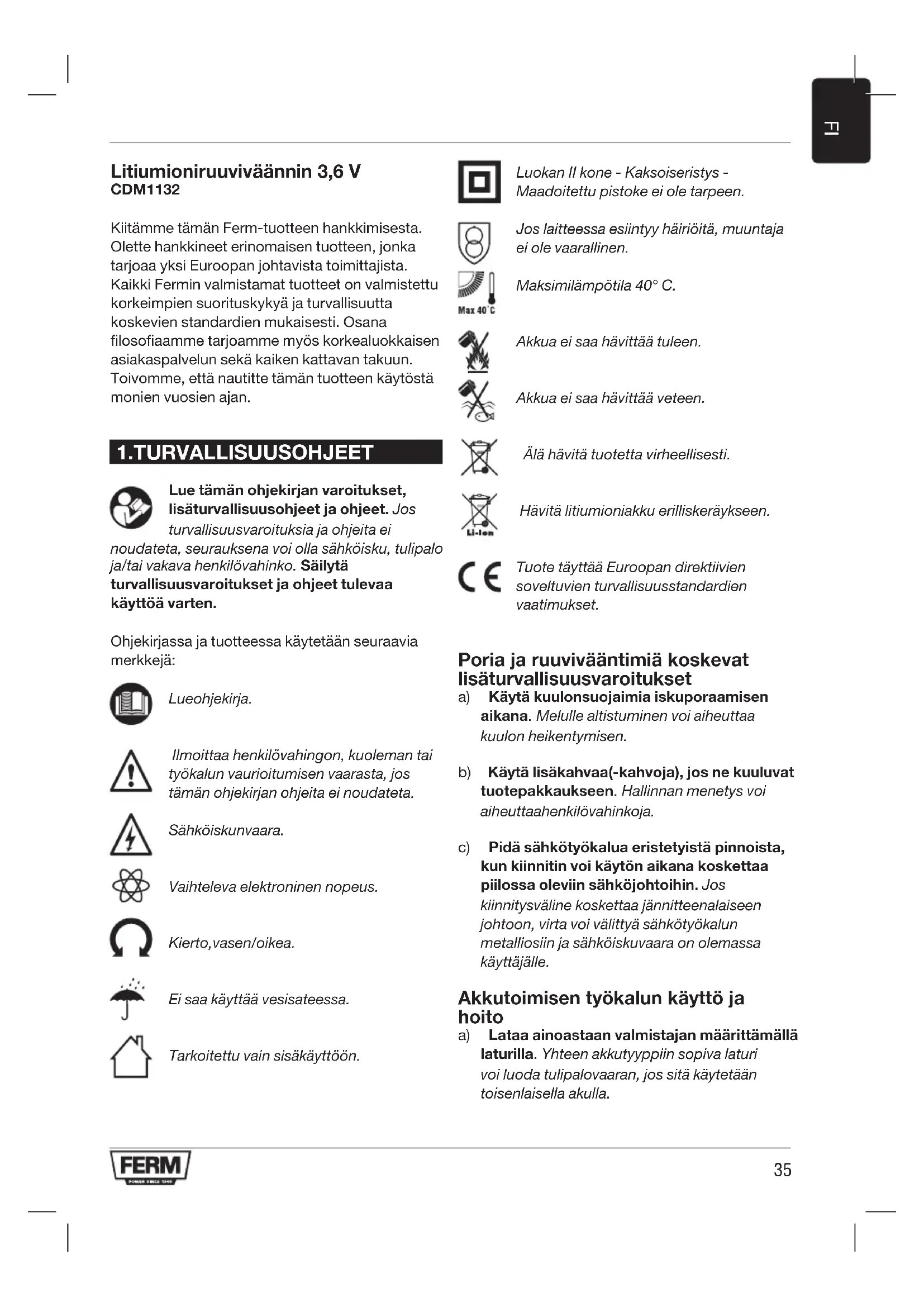 Litiumioniruuviväännin 3,6 V CDM1132 Kiitämme tämän Ferm-tuotteen hankkimisesta. Olette hankkineet erinomaisen tuotteen, jonka tarjoaa yksi Euroopan johtavista toimittajista. Kaikki Fermin valmistamat tuotteet on valmistettu korkeimpien suorituskykyä ja turvallisuutta koskevien standardien mukaisesti. Osana filosofiaamme tarjoamme myös korkealuokkaisen asiakaspalvelun sekä kaiken kattavan takuun. Toivomme, että nautitte tämän tuotteen käytöstä monien vuosien ajan.