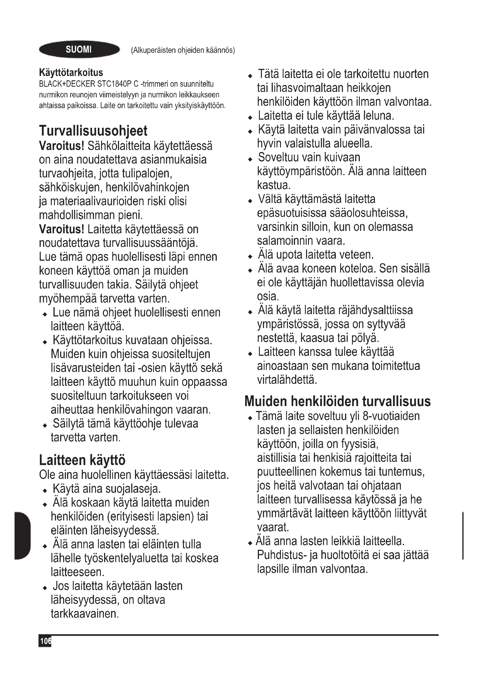 Käyttötarkoitus BLACK+DECKER STC1840P C -trimmeri on suunniteltu nurmikon reunojen viimeistelyyn ja nurmikon leikkaukseen ahtaissa paikoissa. Laite on tarkoitettu vain yksityiskäyttöön. Turvallisuusohjeet Varoitus! Sähkölaitteita käytettäessä on aina noudatettava asianmukaisia turvaohjeita, jotta tulipalojen, sähköiskujen, henkilövahinkojen ja materiaalivaurioiden riski olisi mahdollisimman pieni. Varoitus! Laitetta käytettäessä on noudatettava turvallisuussääntöjä. Lue tämä opas huolellisesti läpi ennen koneen käyttöä oman ja muiden turvallisuuden takia. Säilytä ohjeet myöhempää tarvetta varten. uLue nämä ohjeet huolellisesti ennen laitteen käyttöä. uKäyttötarkoitus kuvataan ohjeissa. Muiden kuin ohjeissa suositeltujen lisävarusteiden tai -osien käyttö sekä laitteen käyttö muuhun kuin oppaassa suositeltuun tarkoitukseen voi aiheuttaa henkilövahingon vaaran. uSäilytä tämä käyttöohje tulevaa tarvetta varten. Laitteen käyttö Ole aina huolellinen käyttäessäsi laitetta. uKäytä aina suojalaseja.uÄlä koskaan käytä laitetta muiden henkilöiden (erityisesti lapsien) tai eläinten läheisyydessä. uÄlä anna lasten tai eläinten tulla lähelle työskentelyaluetta tai koskea laitteeseen. uJos laitetta käytetään lasten läheisyydessä, on oltava tarkkaavainen. uTätä laitetta ei ole tarkoitettu nuorten tai lihasvoimaltaan heikkojen henkilöiden käyttöön ilman valvontaa. uLaitetta ei tule käyttää leluna.uKäytä laitetta vain päivänvalossa tai hyvin valaistulla alueella. uSoveltuu vain kuivaan käyttöympäristöön. Älä anna laitteen kastua. uVältä käyttämästä laitetta epäsuotuisissa sääolosuhteissa, varsinkin silloin, kun on olemassa salamoinnin vaara. uÄlä upota laitetta veteen.uÄlä avaa koneen koteloa. Sen sisällä ei ole käyttäjän huollettavissa olevia osia. uÄlä käytä laitetta räjähdysalttiissa ympäristössä, jossa on syttyvää nestettä, kaasua tai pölyä. uLaitteen kanssa tulee käyttää ainoastaan sen mukana toimitettua virtalähdettä. Muiden henkilöiden turvallisuus u Tämä laite soveltuu yli 8-vuotiaiden lasten ja sellaisten henkilöiden käyttöön, joilla on fyysisiä, aistillisia tai henkisiä rajoitteita tai puutteellinen kokemus tai tuntemus, jos heitä valvotaan tai ohjataan laitteen turvallisessa käytössä ja he ymmärtävät laitteen käyttöön liittyvät vaarat. u Älä anna lasten leikkiä laitteella. Puhdistus- ja huoltotöitä ei saa jättää lapsille ilman valvontaa.107 (Alkuperäisten ohjeiden käännös) SUOMI