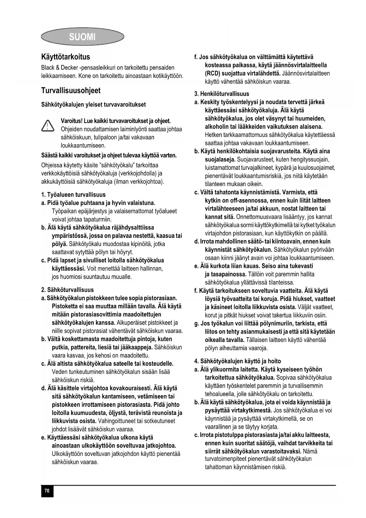 a. Anna koulutettujen ja ammattitaitoisten henkilöiden korjata sähkötyökalusi ja hyväksy korjauksiin vain alkuperäisiä varaosia. Täten varmistat, että sähkötyökalu säilyy turvallisena. Sähkötyökalujen lisäturvavaroitukset Älä pidä kehoa lähellä leikkurin terää. Älä poista leikattua materiaalia tai pidä leikattavasta materiaalista kiinni terien liikkuessa. Varmista, että virta on katkaistu virtakytkimellä, kun poistat jumiutunutta materiaalia. Hetken tarkkaamattomuus pensasleikkuria käytettäessä saattaa johtaa vakavaan loukkaantumiseen. Kanna pensasleikkuria kahvasta, kun leikkurin terä on pysäytetty. Aseta leikkurin suojus paikalleen pensasleikkurin kuljetuksen ja varastoinnin ajaksi. Pensasleikkurin oikea käsittely pienentää leikkurin terien aiheuttamien vammojen riskiä. Pidä kaapeli poissa leikkausalueelta. Käytön aikana kaapeli voi olla piilossa pensaikossa ja voit leikata sitä vahingossa. Vältä kovia esineitä (esimerkiksi metallilankaa, kaiteita) leikkauksen aikana. Jos osut tällaiseen esineeseen vahingossa, katkaise työkalun virta heti ja tarkista vauriot. Pidä työkalusta aina kiinni molemmin käsin työkalun kahvoista. Tätä työkalua ei ole tarkoitettu sellaisten henkilöiden käyttöön, joilla on fyysisiä tai älyllisiä rajoitteita tai aistirajoitteita, eikä laitteen toimintaan perehtymättömien henkilöiden käyttöön (lapset mukaan luettuina), paitsi valvonnan alaisina, tai jos he ovat saaneet laitteen käyttöön liittyvää opastusta heidän turvallisuudestaan vastaavalta henkilöltä. Lapsia on valvottava ja estettävä leikkimästä työkalulla. Työkalun käyttötarkoitus on kuvattu tässä käyttöohjeessa. Käytä työkalua ainoastaan sellaiseen työhön, johon se on tarkoitettu, ja käytä vain käyttöohjeessa ja tuotekuvastossa suositeltuja tarvikkeita ja lisälaitteita. Ohjeesta poikkeava käyttö voi aiheuttaa henkilö- ja/tai omaisuusvahinkoja. Vältä tahatonta käynnistämistä. Älä kanna työkalua siten, että kätesi tai sormesi on etukahvassa tai liipaisinkytkimelle, ellei työkalun virtajohto ole irti tai akku on irrotettu. Varmista, että työkalun virta on katkaistu, kun liität sen virtalähteeseen. Jos et ole ennen käyttänyt pensasleikkuria, pyydä käytännön ohjeita kokeneelta käyttäjältä tämän käyttöoppaan ohjeiden lisäksi. Älä koskaan koske teriin työkalun ollessa käynnissä. Älä jarruta terän pysähtymisliikettä. Älä laske työkalua alas, ennen kuin terät ovat pysähtyneet kokonaan. Tarkista säännöllisesti, etteivät terät ole vahingoittuneet tai kuluneet. Älä käytä työkalua, jos sen terät ovat vioittuneet. Jos työkalu alkaa täristä epätavallisesti, katkaise työkalun virta heti ja tarkista vauriot. Jos työkalu pysähtyy, katkaise sen virta heti. Irrota työkalun virtajohto tai akku, ennen kuin yrität poistaa esteet. Aseta teränsuojus terien päälle käytön jälkeen. Säilytä työkalua siten, ettei sen terä ole paljaana. Varmista, että kaikki suojukset ovat paikallaan työkalua käytettäessä. Älä koskaan yritä käyttää puutteellista työkalua tai työkalua, johon on tehty luvattomia muutoksia. Älä koskaan anna lasten käyttää työkalua. Varo putoavia oksia, kun leikkaat pensasaidan yläreunoja. Muiden turvallisuus Tätä laitetta ei ole tarkoitettu sellaisten henkilöiden käyttöön, joilla on fyysisiä tai älyllisiä rajoitteita tai aistirajoitteita, eikä laitteen toimintaan perehtymättömien henkilöiden käyttöön (lapset mukaan luettuina), paitsi valvonnan alaisina tai jos he ovat saaneet laitteen käyttöön liittyvää opastusta heidän turvallisuudestaan vastaavalta henkilöltä. Lapsia on valvottava ja heitä on estettävä leikkimästä laitteella. Pensasleikkurin turvavaroitukset. !72 SUOMI Tärinä Teknisissä tiedoissa ja vaatimustenmukaisuusvakuutuksessa ilmoitettu tärinäpäästöarvo on mitattu EN 60745 -standardin testausmenetelmän mukaisesti, ja sen avulla voidaan vertailla työkaluja keskenään. Ilmoitettua tärinäpäästöarvoa voidaan käyttää myös altistumisen alustavaan arviointiin. Varoitus! Sähkötyökalun käytön aikana mitattu todellinen tärinäpäästöarvo voi poiketa ilmoitetusta tärinäpäästöarvosta työkalun käyttötavan mukaan. Tärinätaso voi olla ilmoitettua tasoa suurempi. Kun tärinälle altistumista arvioidaan sen määrittämiseksi, mitä direktiivin 2002/44/EY mukaisia turvatoimenpiteitä vaaditaan sähkötyökaluja säännöllisesti käyttävien henkilöiden suojelemiseksi, tärinälle altistumisen arvioinnissa on otettava huomioon todelliset käyttöolosuhteet ja työkalun käyttötavat. Todellisen käytön lisäksi on kiinnitettävä huomiota myös siihen, milloin työkalu on sammutettuna tai se käy tyhjänä. Laitteissa olevat merkinnät Työkalussa on seuraavat kuvakemerkinnät: Sähköturvallisuus Tämä laite on kaksoiseristetty, joten erillistä maadoitusta ei tarvita. Tarkista aina, että virtalähde vastaa arvokilvessä ilmoitettua jännitettä. Jos virtajohto vahingoittuu, sen vaihtaminen tulee turvallisuussyistä jättää valmistajan tai valtuutetun Black & Decker -huollon tehtäväksi. Sähköturvallisuutta voi parantaa käyttämällä erittäin herkkää (30 mA) vikavirtasuojaa. Jatkojohdon käyttäminen Käytä aina hyväksyttyä, työkalun virtaliitäntään sopivaa jatkojohtoa (katso tekniset tiedot). Jatkojohdon on oltava ulkokäyttöön soveltuva ja siinä on oltava vastaava merkintä. Laitteen kanssa voidaan käyttää enintään 30 m pitkää 1,5 mm