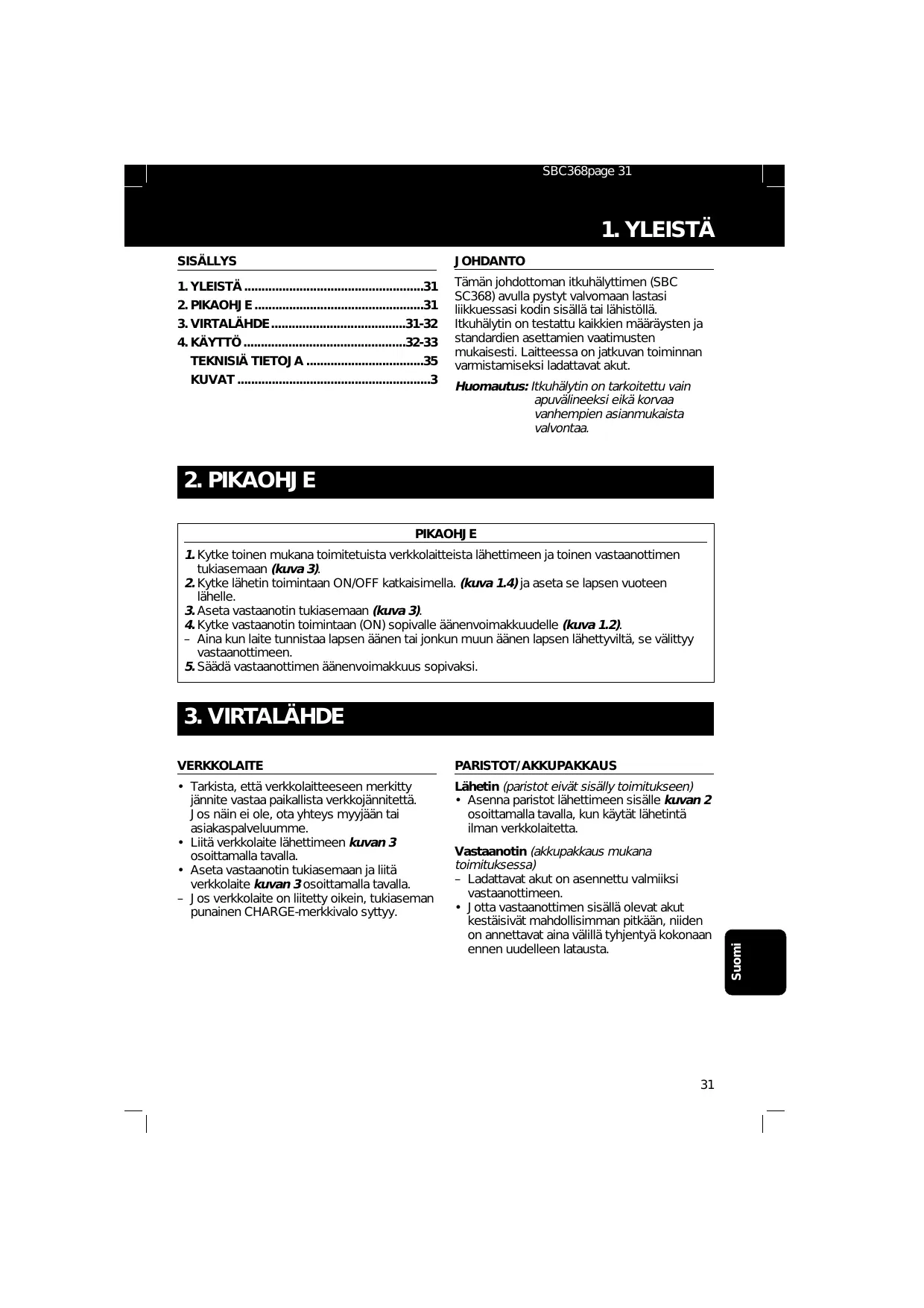 TEKNISIÄ TIETOJA ..................................35 KUVAT ........................................................3 Tämän johdottoman itkuhälyttimen (SBC SC368) avulla pystyt valvomaan lastasi liikkuessasi kodin sisällä tai lähistöllä. Itkuhälytin on testattu kaikkien määräysten ja standardien asettamien vaatimusten mukaisesti. Laitteessa on jatkuvan toiminnan varmistamiseksi ladattavat akut. Huomautus: Itkuhälytin on tarkoitettu vain apuvälineeksi eikä korvaa vanhempien asianmukaista valvontaa.