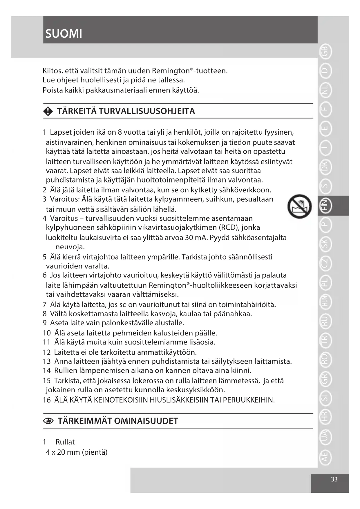 1 Lapset joiden ikä on 8 vuotta tai yli ja henkilöt, joilla on rajoitettu fyysinen, aistinvarainen, henkinen ominaisuus tai kokemuksen ja tiedon puute saavat käyttää tätä laitetta ainoastaan, jos heitä valvotaan tai heitä on opastettu laitteen turvalliseen käyttöön ja he ymmärtävät laitteen käytössä esiintyvät vaarat. Lapset eivät saa leikkiä laitteella. Lapset eivät saa suorittaa puhdistamista ja käyttäjän huoltotoimenpiteitä ilman valvontaa. 2 Älä jätä laitetta ilman valvontaa, kun se on kytketty sähköverkkoon. 3 Varoitus: Älä käytä tätä laitetta kylpyammeen, suihkun, pesualtaan tai muun vettä sisältävän säiliön lähellä. 4 Varoitus – turvallisuuden vuoksi suosittelemme asentamaan kylpyhuoneen sähköpiiriin vikavirtasuojakytkimen (RCD), jonka luokiteltu laukaisuvirta ei saa ylittää arvoa 30 mA. Pyydä sähköasentajalta neuvoja. 5 Älä kierrä virtajohtoa laitteen ympärille. Tarkista johto säännöllisesti vaurioiden varalta. 6 Jos laitteen virtajohto vaurioituu, keskeytä käyttö välittömästi ja palauta laite lähimpään valtuutettuun Remington®-huoltoliikkeeseen korjattavaksi tai vaihdettavaksi vaaran välttämiseksi. 7 Älä käytä laitetta, jos se on vaurioitunut tai siinä on toimintahäiriöitä. 8 Vältä koskettamasta laitteella kasvoja, kaulaa tai päänahkaa. 9 Aseta laite vain palonkestävälle alustalle. 10 Älä aseta laitetta pehmeiden kalusteiden päälle. 11 Älä käytä muita kuin suosittelemiamme lisäosia. 12 Laitetta ei ole tarkoitettu ammattikäyttöön. 13 Anna laitteen jäähtyä ennen puhdistamista tai säilytykseen laittamista. 14 Rullien lämpenemisen aikana on kannen oltava aina kiinni. 15 Tarkista, että jokaisessa lokerossa on rulla laitteen lämmetessä, ja että jokainen rulla on asetettu kunnolla keskusyksikköön. 16 ÄLÄ KÄYTÄ KEINOTEKOISIIN HIUSLISÄKKEISIIN TAI PERUUKKEIHIN.