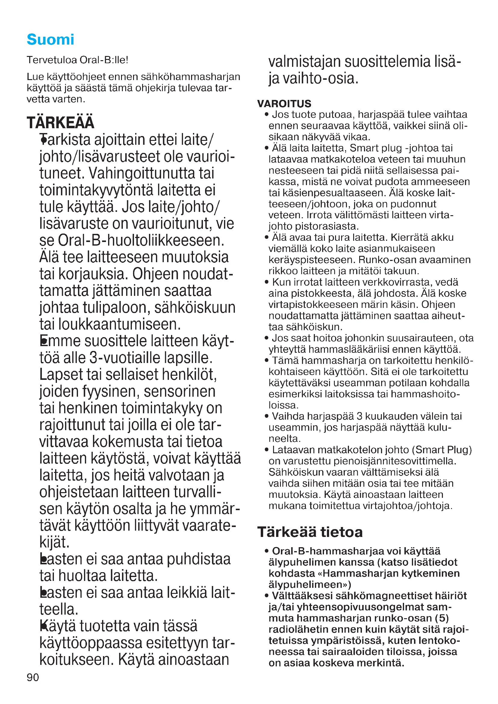 60 °C). Rekommenderad omgivande temperatur vid laddning är 5 °C till 35 °C. 90639632_D701_WE_S6-112.indd 8990639632_D701_WE_S6-112.indd 89 24.11.15 14:4924.11.15 14:49 CSS APPROVED Effective Date 18Jan2016 GMT - Printed 04Apr2016 Page 89 of 11290 Tervetuloa Oral-B:lle! Lue käyttöohjeet ennen sähköhammasharjan käyttöä ja säästä tämä ohjekirja tulevaa tar- vetta varten. TÄRKEÄÄ