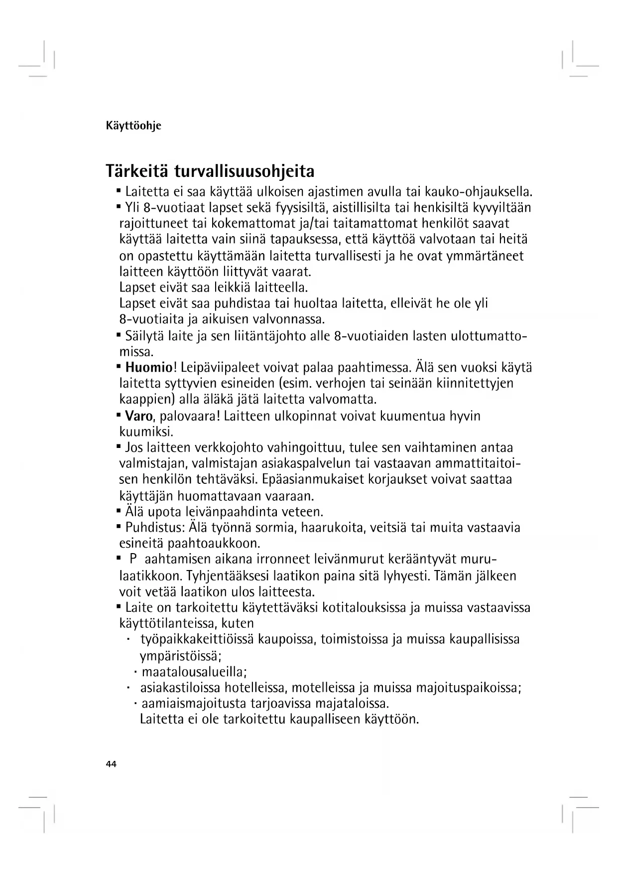 - Alä työnna sormia,haarukoita,veitsiä tai muita vastaavia esineitä paahtoaukloon.