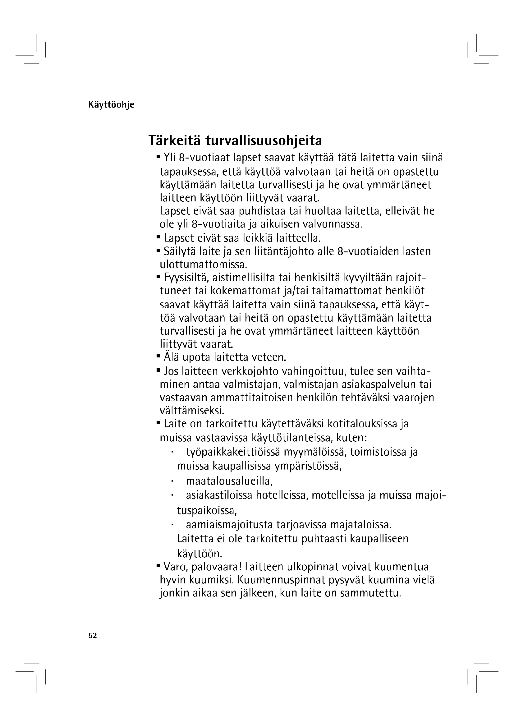 - Varo, palovaara! Laitteen ulkopinnat voivat kuumentua hyvin kuumiksi. Kuumennuspinnat pysyvät kuumina vielä jonkin aikaa sen jälkeen, kun laite on sammutettu. Käyttöohje53