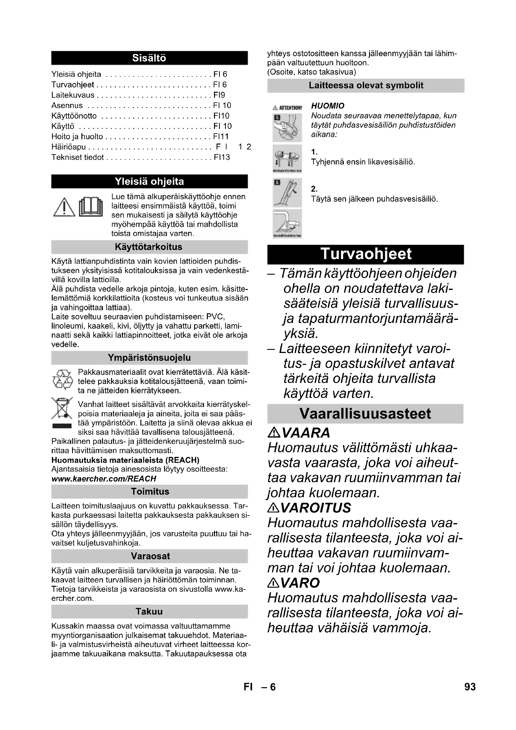• FC 3 Cordless ** FC 3 Cordless Premium Laitekuvaus 1 PÄÄLLE-/POIS-kytkin 2 Käsikahva 3 Liukueste, kahva 4 Raikasvesisäiliö 5 Puhdasvesisäiliön kahvasyvennys 6 Latausliitin 7 Likavesisäiliö 8 Puhdistustelan kädensijasyvennys 9 Puhdistustelat 10 Lattiapään suojus 11 Lattiapään suojuksen lukitus 12 Akkunäyttö 13 Latauslaite ja latausjohto 14 Pysäköintiasema 15 Telojen säilytyspaikka 16 * Puhdistusaine RM 536 30 ml 17 ** Puhdistusaine RM 534 30 ml 18 ** Puhdistusaine RM 536 500 ml 19 Vaahdonestoaine FoamStop 30 ml 9 ** Puhdistustelat 2x 96 FI– 10 Kuva Työnnä kädensijalistaa peruslaitteeseen vastee- seen saakka, kunnes kädensija lukittuu kuuluvasti. Kädensijalistan täytyy olla tiukasti laitteessa kiinni. Kuva Aseta laite pysäköintiasemaan, jotta se pysyy var- masti paikallaan. Kuva Kierrä puhdistustelat vasteeseen saakka telanpiti- meen sisään. Kiinnitä huomiota telojen sisäpuolen ja telanpiti- men värimerkintöihin laitteessa (esim.sininen sini- seen). Tarkasta asennuksen jälkeen, ovatko puhdistuste- lat tiukasti kiinni. Kuva Yhdistä laturin latausjohto laitteen latausliittimeen. Pistä latauslaitteen verkkopistoke pistorasiaan. Kuva LED-merkkivalot näyttävät akun senhetkisen la- taustilan. Kun ladataan täysin tyhjää akkua, kaikki kolme LED-merkkivaloa vilkkuvat alhaalta ylös peräkkäin. Kun akussa on latausta 1/3, palaa alin LED koko ajan ja ylemmät LED-valot vilkkuvat edelleen. Kun akussa on latausta 2/3, palavat alimmat LED- valot koko ajan ja ylin LED-valo vilkkuu edelleen. Kun akku on täysin ladattu, 3 LED-merkkivaloa pa- lavat 60 minuuttia koko ajan. Sen jälkeen LED- merkkivalot sammuvat. Kuva Irrota verkkopistoke pistorasiasta ja latauskaapeli latausliittimestä latauksen jälkeen. Kuva Aseta laite pysäköintiasemaan. Kuva Tartu puhdasvesisäiliön kahvasyvennykseen ja poista puhdasvesisäiliö laitteesta. Kuva Avaa säiliön luukku ja käännä se sivuun. Kuva Täytä puhdasvesisäiliö kylmällä tai haalealla vesi- johtovedellä. Tarvittaessa puhdasvesisäiliöön voidaan täyttää KÄRCHERin puhdistus- tai hoitoaineita.* "MAX"-merkintää ei saa täytettäessä ylittää. Sulje polttoainesäiliön korkki. Kuva Aseta tuorevesisäiliö laitteeseen. Puhdasvesisäiliön täytyy olla tiukasti laitteessa kiinni. HUOMIO *Puhdistus- tai hoitoaineen annostelusuositukseen on kiinnitettävä huomiota. HUOMIO Kuva Laitteella voi kerätä vain kuivunutta likaa ja nesteitä (enint. 140 ml). Kuva Lakaise tai imuroi lattia ennen työn aloittamista. Näin lattiasta poistetaan lika ja irralliset hiukkaset jo ennen kosteaa puhdistusta. Tarkasta lattian vedenkestävyys ennen laitteen käyttöä jostain huomaamattomasta kohdasta. Mitään vedelle herkkiä pintoja kuten käsittelemättömiä korkkilattioita ei saa puhdistaa (kosteutta voi päästä sisään lattiaan ja vaurioittaa sitä). Kuva Jotta juuri pyyhitylle lattialle ei synny jalanjälkiä, työs- kentele taaksepäin oven suuntaan. Lattian puhdistus tapahtuu liikuttamalla laitetta eteen- ja taaksepäin samalla nopeudella, kuin käy- tettäessä pölynimuria. Jos likaa on erittäin paljon, laitteen voi antaa hi- taasti liukua lattian yli. Laitetta ei tarvitse painaa. Jos toimitukseen kuuluu harmaa ja keltainen tela- pari: Molemmilla telapareilla on samat toiminnot, mutta niitä voidaan käyttää eri käyttöalueilla (erot- telu värin perusteella esim. keittiötä ja kylpyhuonet- ta varten). HUOMIO Heti kun laite käynnistetään, puhdistustelat alkavat pyö- riä. Jotta laite ei liiku itsestään, sitä täytyy pitää käden- sijasta kiinni. Varmista, että puhdasvesisäiliö on täytetty vedellä ja li- kavesisäiliö asetettu laitteeseen. Kuva Käynnistä laite painamalla On/Off -laitekytkintä. Vie laitetta useita kertoja eteen ja taakse, kunnes telat ovat riittävän kosteat. Kuva – 3 LEDiä palaa - 3/3 akun toiminta-ajasta (täysi toi- minta-aika) – 2 LEDiä palaa - 2/3 akun toiminta-ajasta. – 1 LED palaa - 1/3 akun toiminta-ajasta. Alin LED vilkkuu n. 2 minuuttia ennen akun tyhjen- tymistä. Kun akku on tyhjä ja laite on kytkeytynyt pois pääl- tä, alin LED vilkkuu nopeammin 60 sekuntia. HUOMIO Tyhjennä likavesisäiliö ennen puhdasvesisäiliön täyt- töä. Näin voidaan välttää likavesisäiliön ylivuotaminen. Katso luku ”Puhdasvesisäiliön täyttäminen”. Katso luku "Likavesisäiliön tyhjennys". Asennus Käyttöönotto Telojen asentaminen Lataustapahtuma Tuorevesisäiliön täyttö Käyttö Yleiset käyttöohjeet Puhdistustyön aloitus Akun toiminta-aika Puhdistusaineen jälkitäyttö 97FI– 11 Kuva Aseta laite pysäköintiasemaan. Kuva Paina lattiapään suojuksen lukitusta. Irrota lattiapään suojus. Kuva Irrota likavesisäiliö lattiapäästä. Kuva Avaa kummankin likavesisäiliön päällä olevat lä- pät. Tyhjennä likavesisäiliö. Kuva Puhdista lattiapään suojus ja likavesisäiliö likaisuu- desta riippuen vesijohtovedellä. Kummankin likavesisäiliön kammion läpät voi irrot- taa ja puhdistaa erikseen. Aseta kummankin likavesisäiliön kammion läpät ta- kaisin ja sulje ne. Kuva Aseta likavesisäiliö lattiapäähän. Kuva Paina lattiapään lukitusta, aseta suojus lattiapäälle ja vapauta sitten lukitus. Likavesisäiliön ja lattiapään suojuksen on oltava tiukasti kiinni laitteessa. HUOMIO Suosittelemme laittamaan laitteen pitkien työtaukojen ajaksi pysäköintiasemaan, jotta märät telat eivät vauri- oita herkkiä lattioita. Kuva Kytke laite pois päältä painamalla laitekytkintä päälle/pois. Kuva Aseta laite pysäköintiasemaan. Kuva Kytke laite pois päältä painamalla laitekytkintä päälle/pois. Kuva Aseta laite pysäköintiasemaan. HUOMIO Puhdista laite töiden päättymisen jälkeen. Kuva Jos puhdasvesisäiliössä on vielä vettä, poista se. Kuva – Puhdista likavesisäiliö, lattiapään suojus ja puhdis- tustelat. Katso luku ”Likavesisäiliön puhdistaminen”. Katso luku ”Lattiapään puhdistaminen”. Katso luku 