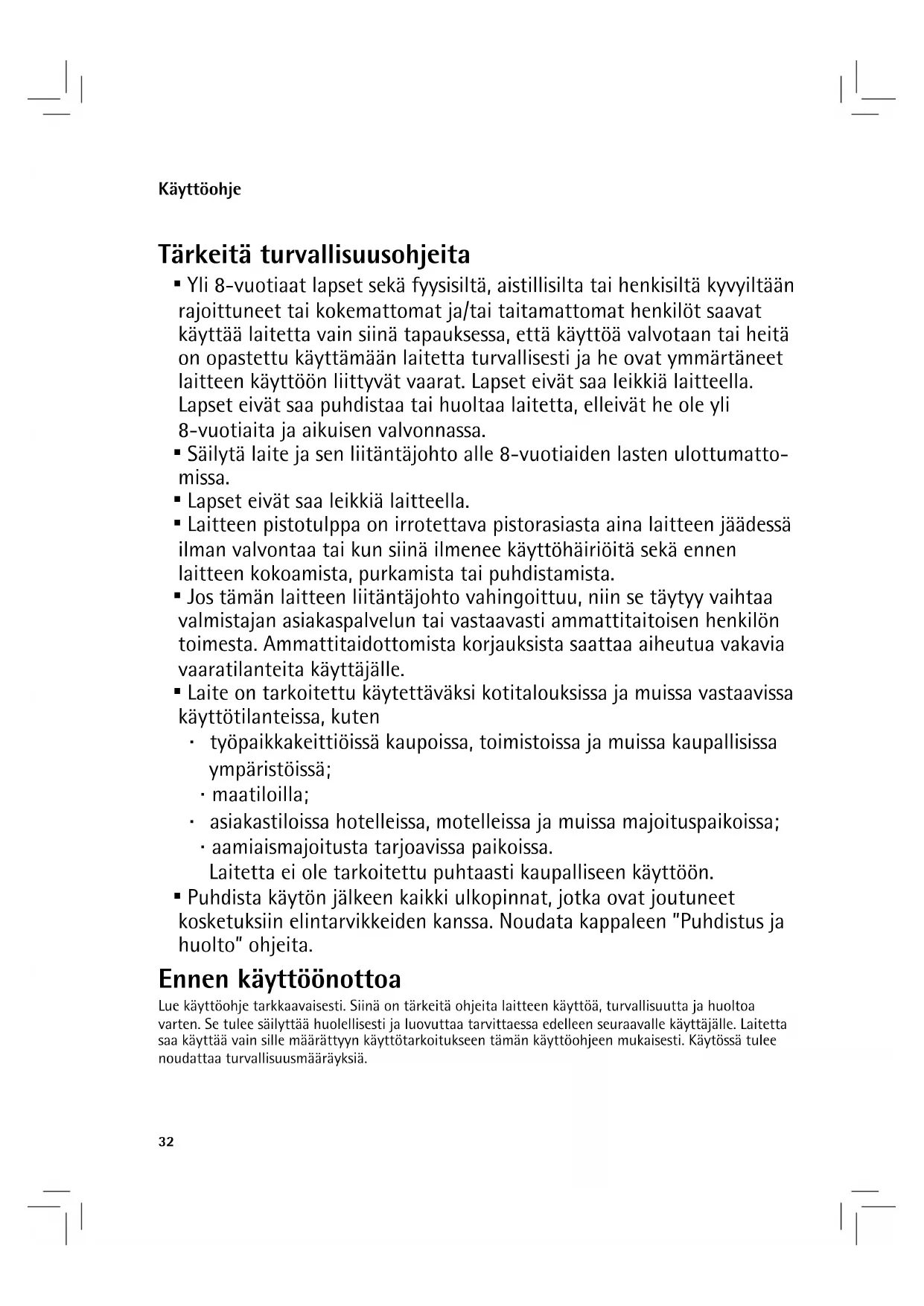 - Yli 8-vuotiaat lapset sekä fyysilta, aistillisilta tai henkisiltä kyvyiltäan rajoittuneet tai kokemattomat ja/tai taitamattomat henkilöt saavat käyttaa laitetta vain siinä tapauksessa, että käyttoa valvotaan tai heita on opastetu käytämän laitetta turvallisesti ja he ovat ymmärtneet laitteen käyttoön liittyvat vaarat. Lapset eivat saa leikkä laitteella. Lapset eivat saa puhdistaa tai huoltaa laitetta, elleivat he ole yli 8-vuotiaita ja aikuisen valvonnassa.