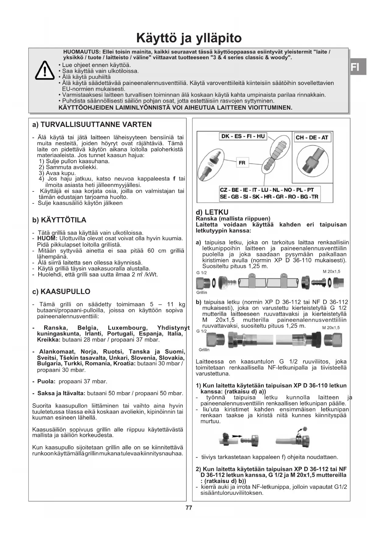 /kWt. c) KAASUPULLO - Tämä grilli on säädetty toimimaan 5 – 11 kg butaani/propaani-pulloilla, joissa on käyttöön sopiva paineenalennusventtiili: - Ranska, Belgia, Luxembourg, Yhdistynyt kuningaskunta, Irlanti, Portugali, Espanja, Italia, Kreikka: butaani 28 mbar / propaani 37 mbar. - Alankomaat, Norja, Ruotsi, Tanska ja Suomi, Sveitsi, Tšekin tasavalta, Unkari, Slovenia, Slovakia, Bulgaria, Turkki, Romania, Kroatia: butaani 30 mbar / propaani 30 mbar. - Puola: propaani 37 mbar. - Saksa ja Itävalta: butaani 50 mbar / propaani 50 mbar. Suorita kaasupullon liittäminen tai vaihto aina hyvin tuuletetussa tilassa eikä koskaan avoliekin, kipinöinnin tai kuuman esineen lähellä. Kaasusäiliön sopivuus grillin alle riippuu käytettävästä mallista ja säiliön korkeudesta. Kun kaasupullo sijoitetaan grillin alle on se kiinnitettävä runkoon käyttämällä grillin mukana tulevaa kiinnitysnauhaa. d) LETKU Ranska (mallista riippuen) Laitetta voidaan käyttää kahden eri taipuisan letkutyypin kanssa: a) taipuisa letku, joka on tarkoitus laittaa renkaallisiin letkunippoihin laitteen ja paineenalennusventtiilin puolella ja joka saadaan pysymään paikallaan kiristimien avulla (normin XP D 36-110 mukaisesti). Suositeltu pituus 1,25 m. b) taipuisa letku (normin XP D 36-112 tai NF D 36-112 mukaisesti), joka on varustettu kierteistetyllä G 1/2 mutterilla laitteeseen ruuvattavaksi ja kierteistetyllä M 20x1,5 mutterilla paineenalennusventtiiliin ruuvattavaksi, suositeltu pituus 1,25 m. Laitteessa on kaasuntulon G 1/2 ruuviliitos, joka toimitetaan renkaallisella NF-letkunipalla ja tiivisteellä varustettuna.