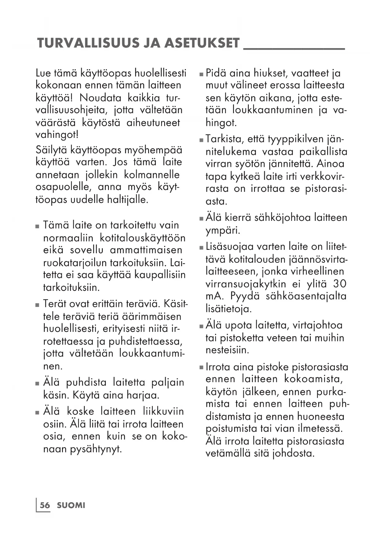 Pidä aina hiukset, vaatteet ja muut välineet erossa laitteesta sen käytön aikana, jotta este- tään loukkaantuminen ja va- hingot.