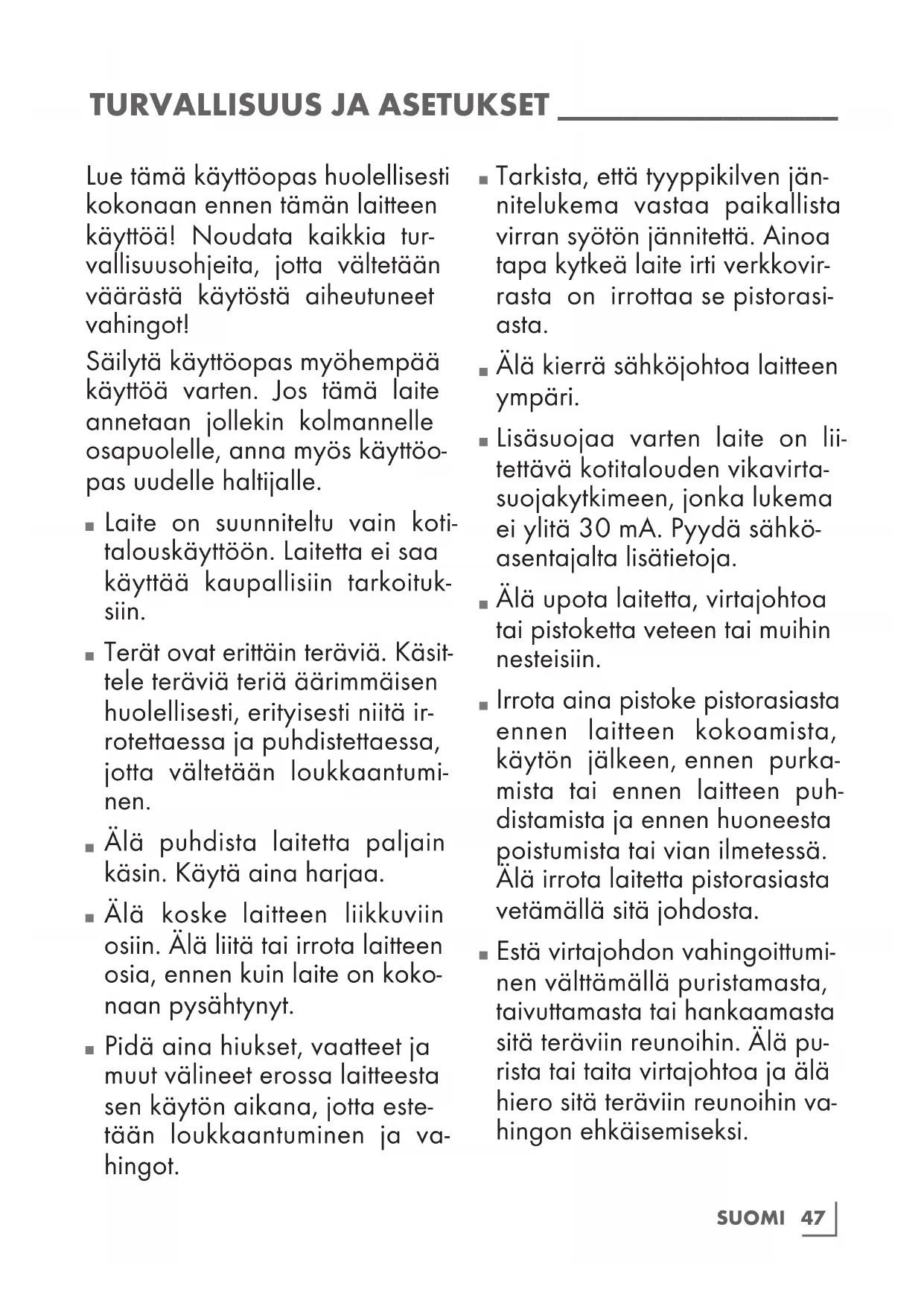 Pidä aina hiukset, vaatteet ja muut välineet erossa laitteesta sen käytön aikana, jotta este- tään loukkaantuminen ja va- hingot.